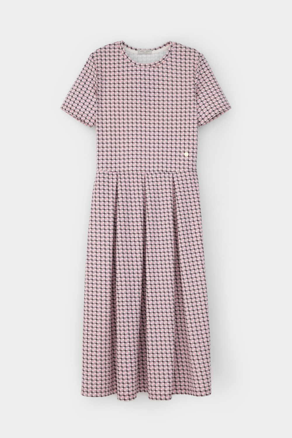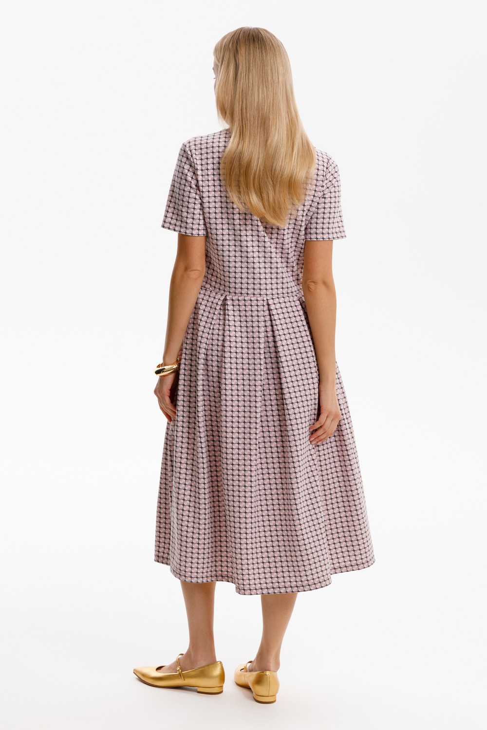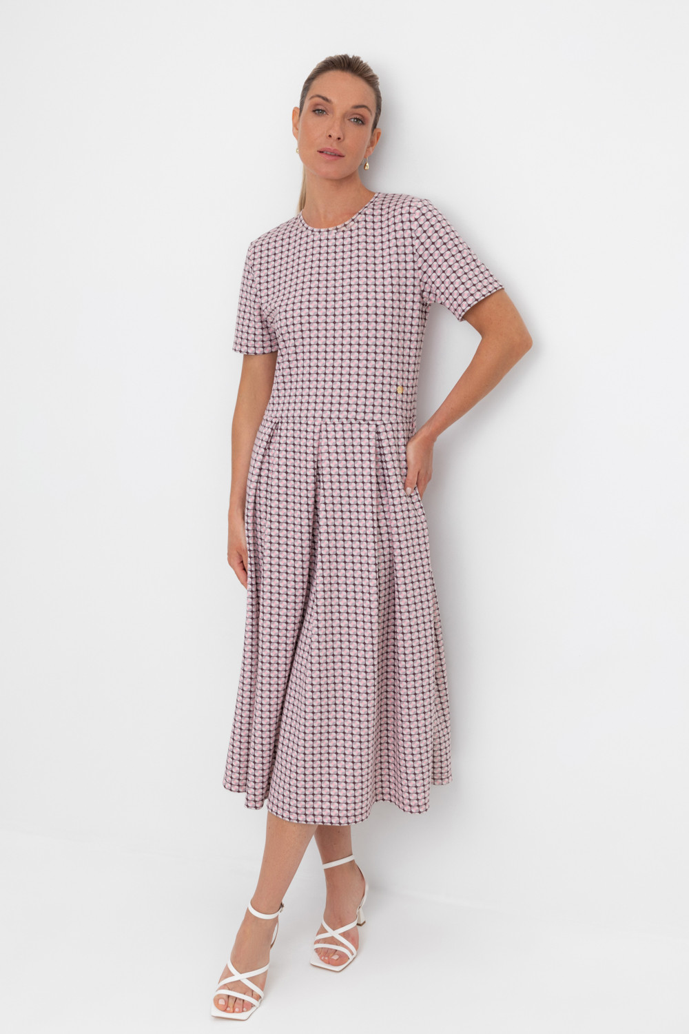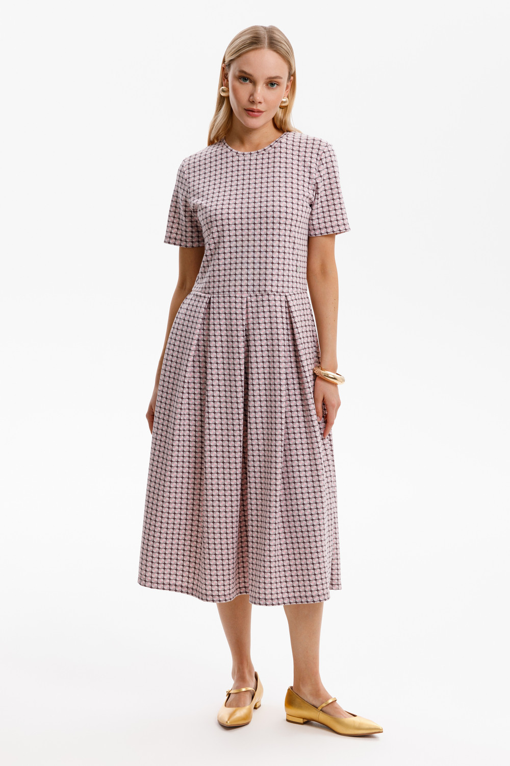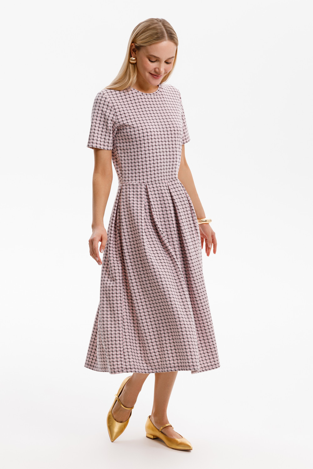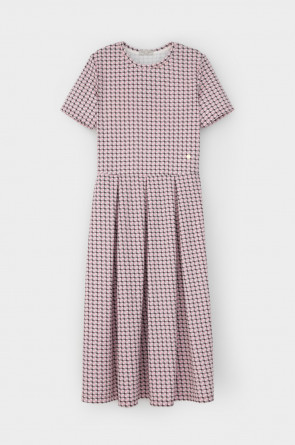 Платье отрезное по талии из премиального трикотажного полотна DOUBLE FACE. Встречные складки на юбке придают изделию женственный и романтичный образ. Яркий геометрический рисунок добавляет летнего настроения. Натуральный состав трикотажа приятен к телу, что делает его комфортным при носке в любое время года