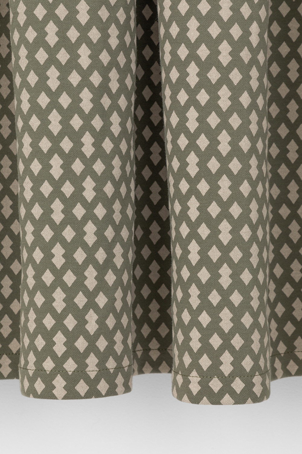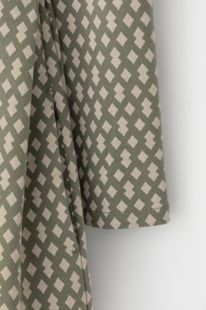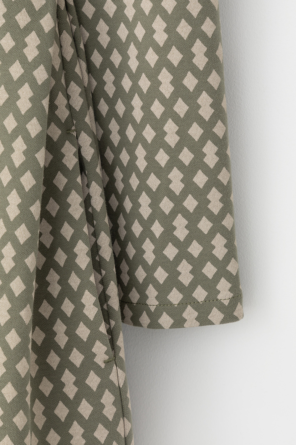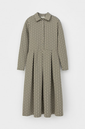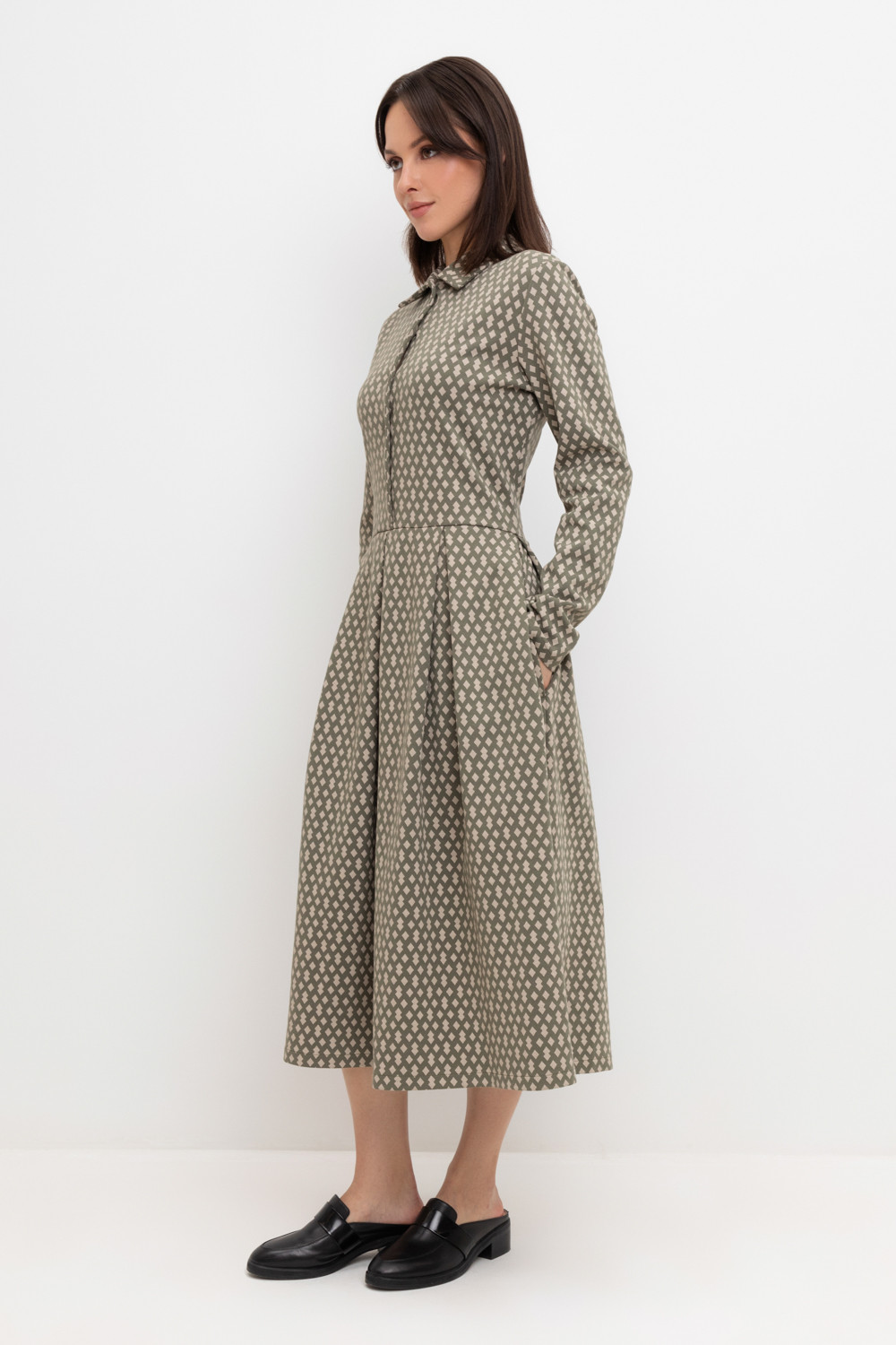 Платье с воротником из плотного набивного трикотажа интерлок. Модель с длинными рукавами и юбкой в складку. Все трикотажные полотна производятся в соответствии с нормами Швейцарского сертификата ЭкоТекс. Сделано в России