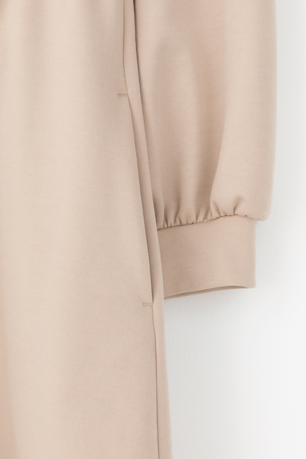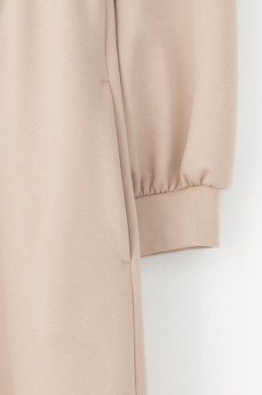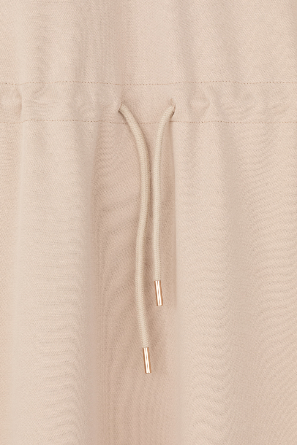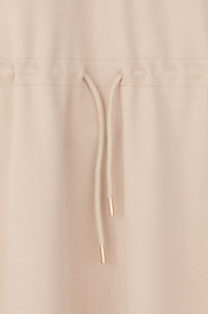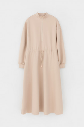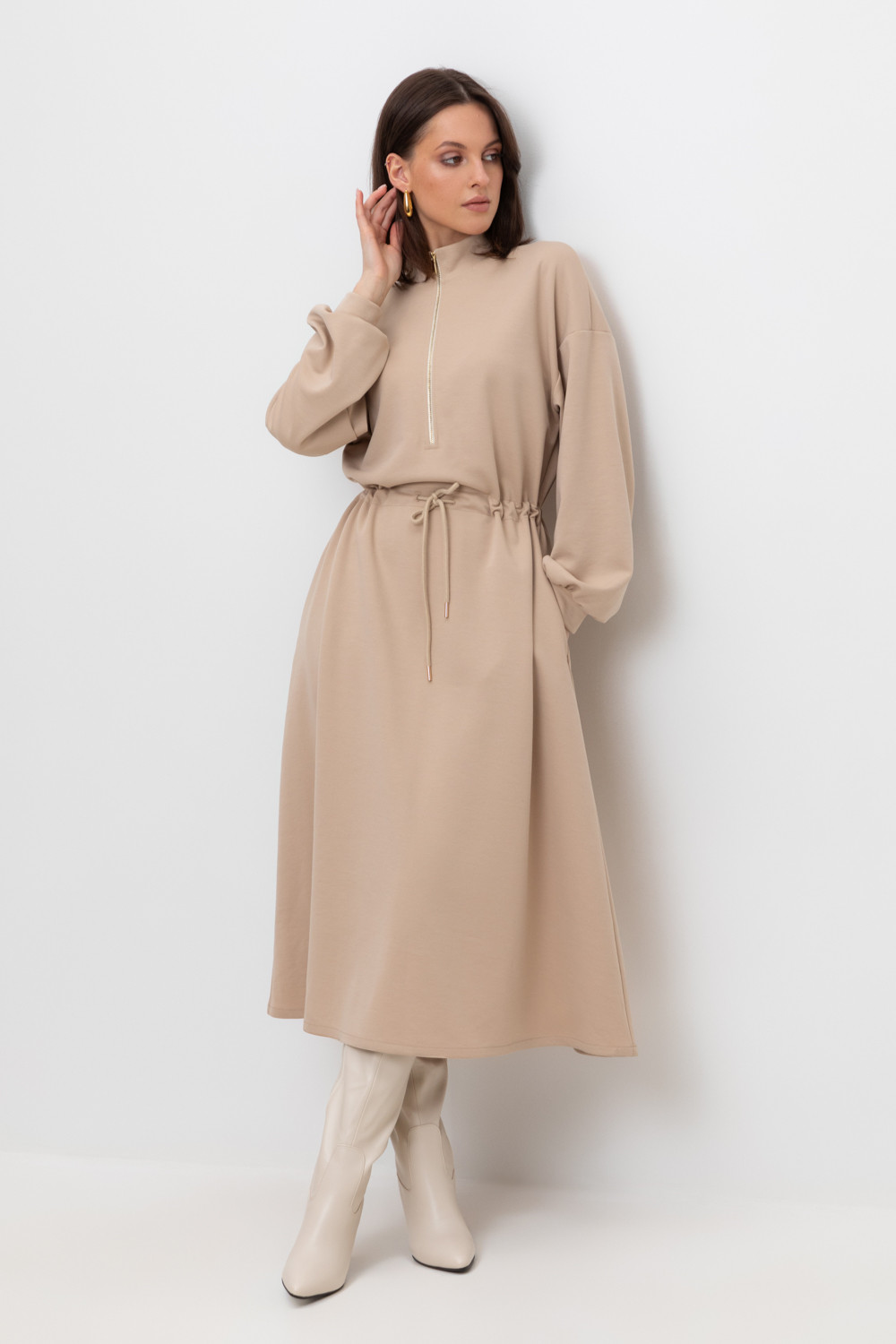 Платье с кулиской из плотного гладкого трикотажа интерлок с застежкой на молнию. Кулиска по линии талии подчеркивает женственность пропорций. Шнурок с наконечниками для утяжки служит украшением. Спущенное плечо придает изделию свободный силуэт.