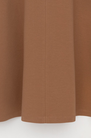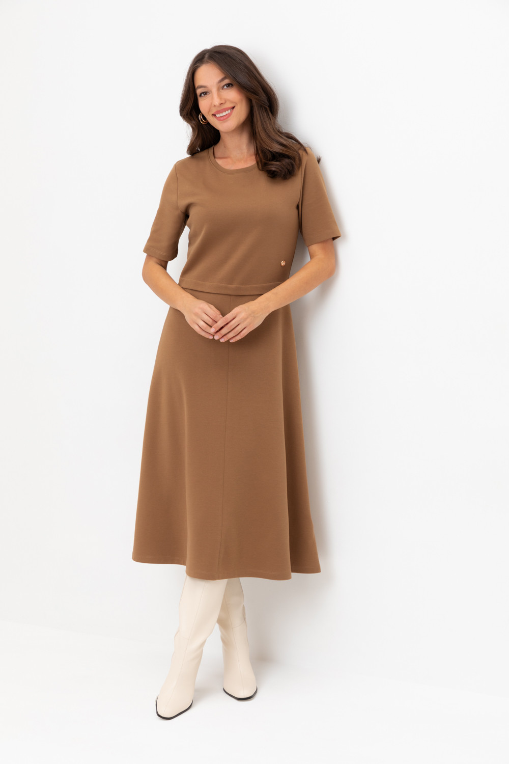 Платье с круглым вырезом и короткими рукавами из плотного трикотажа интерлок. Модель с трапециевидной юбкой.