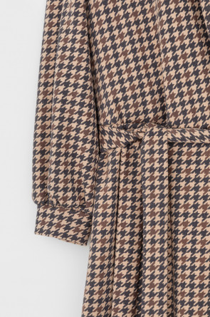 Платье на запах с воротником из плотного набивного трикотажа интерлок. Модель с длинными объемными рукавами. С помощью пояса можно регулировать посадку и силуэт.