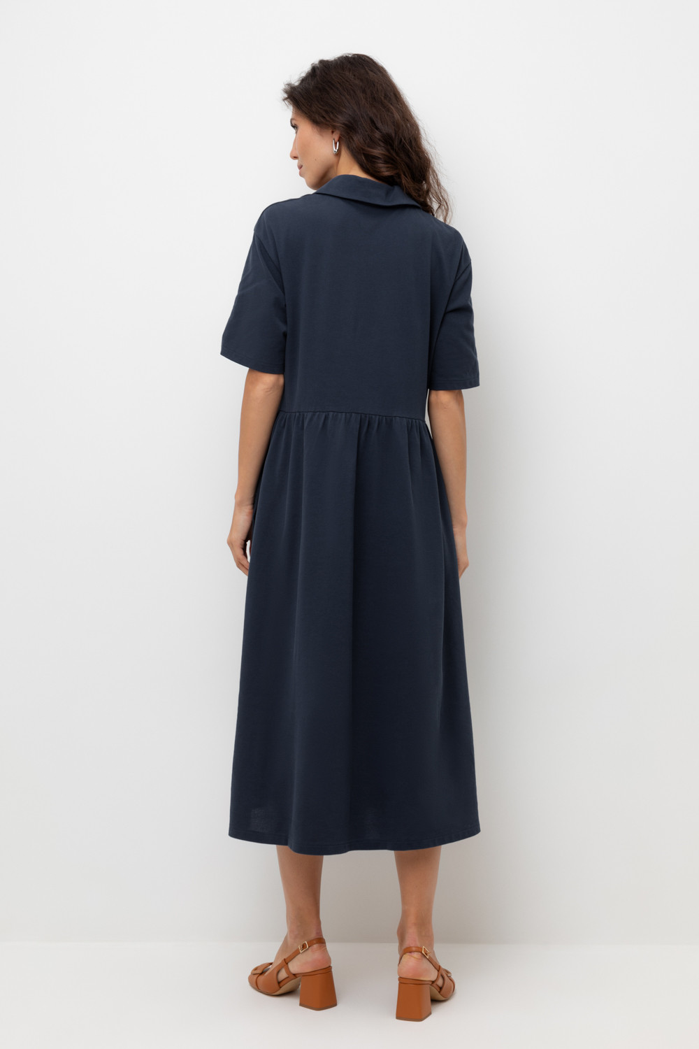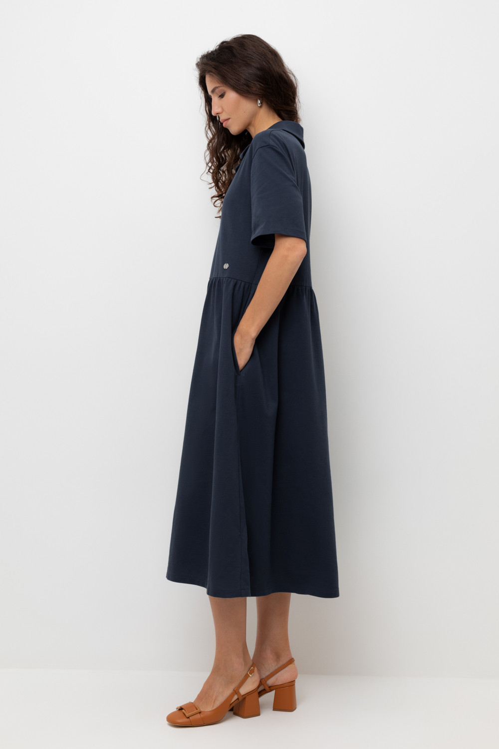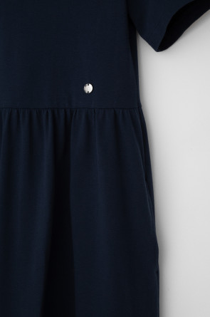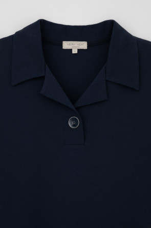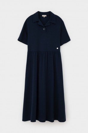 Летнее платье в стиле поло выполненно из премиального трикотажа пике. Свободный силуэт, наличие боковых карманов придают изделию спортивный и одновременно романтический стиль. 100% хлопок в составе обеспечивает комфорт в жаркую погоду. Глубокий чернильный цвет является основой всех морских коллекций.