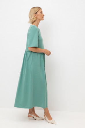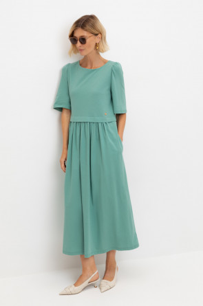 Легкое трикотажное платье из высококачественного гребенного хлопка, который обеспечивает комфорт в жаркую погоду. Свободу движения придает силуэт, сборка по рукаву и поясу романтичности, а наличие боковых карманов - функциональности.