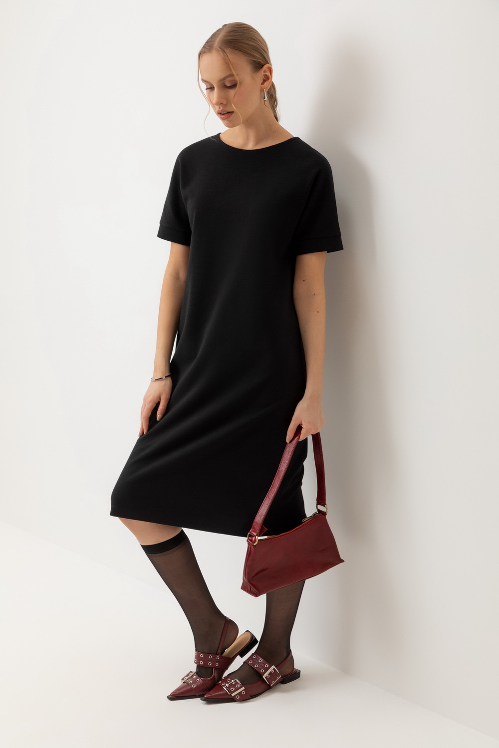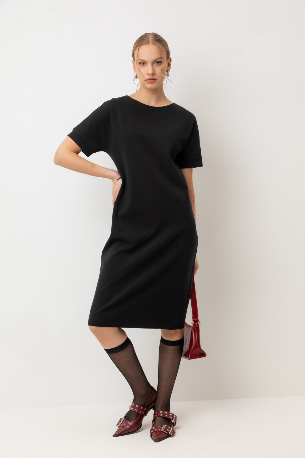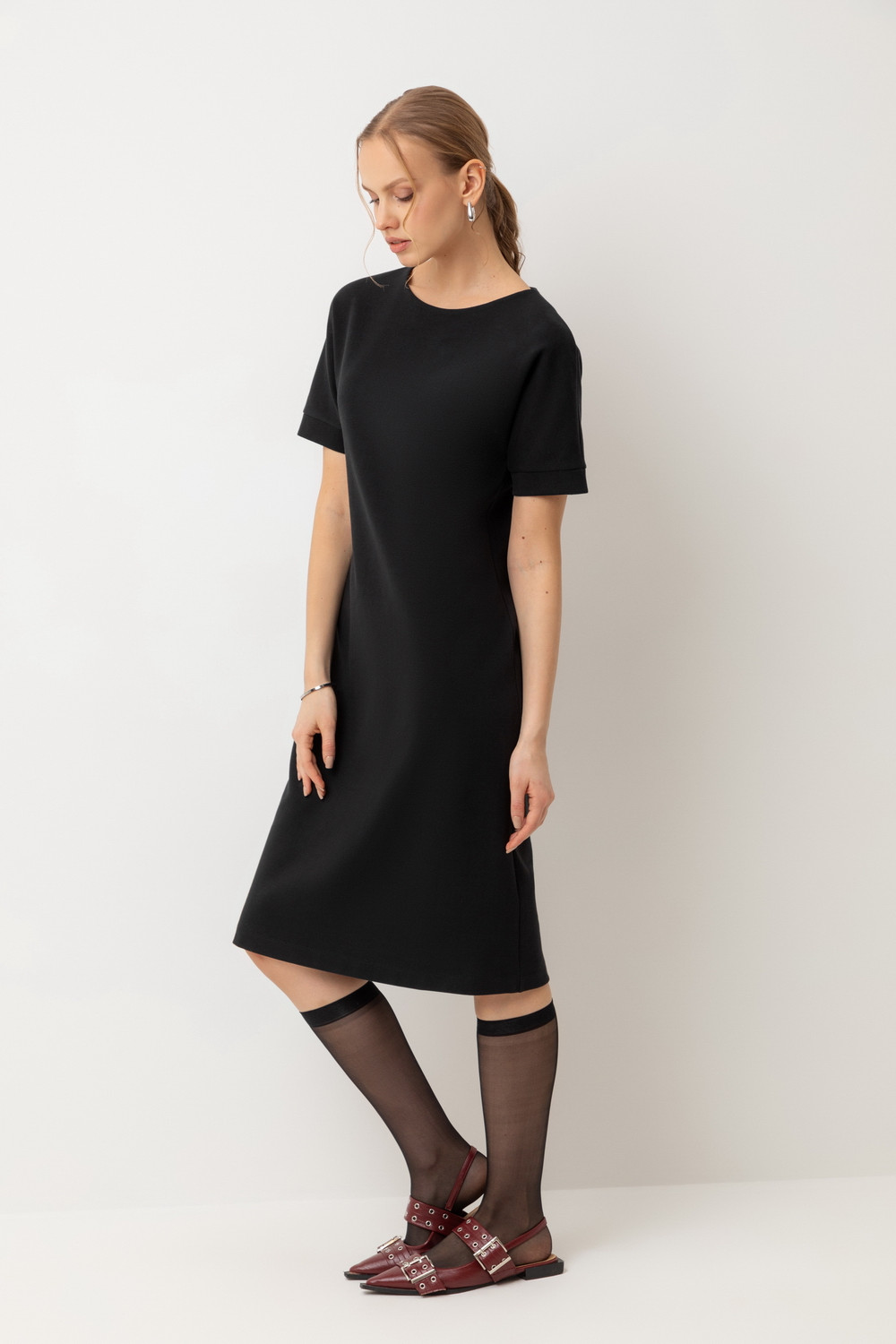 Платье прямого силуэта, выполненное из высококачественного трикотажного полотна DOUBLE FACE с добавлением спандекса. Прямой крой акцентирует внимание на фигуре, формируя элегантный классический стиль.