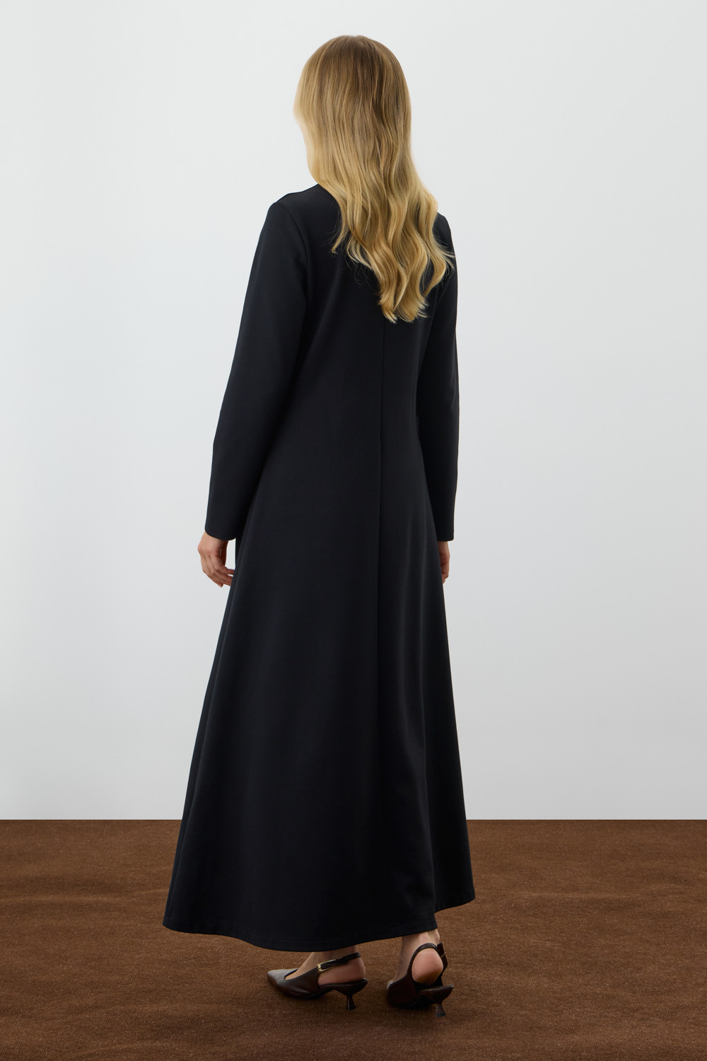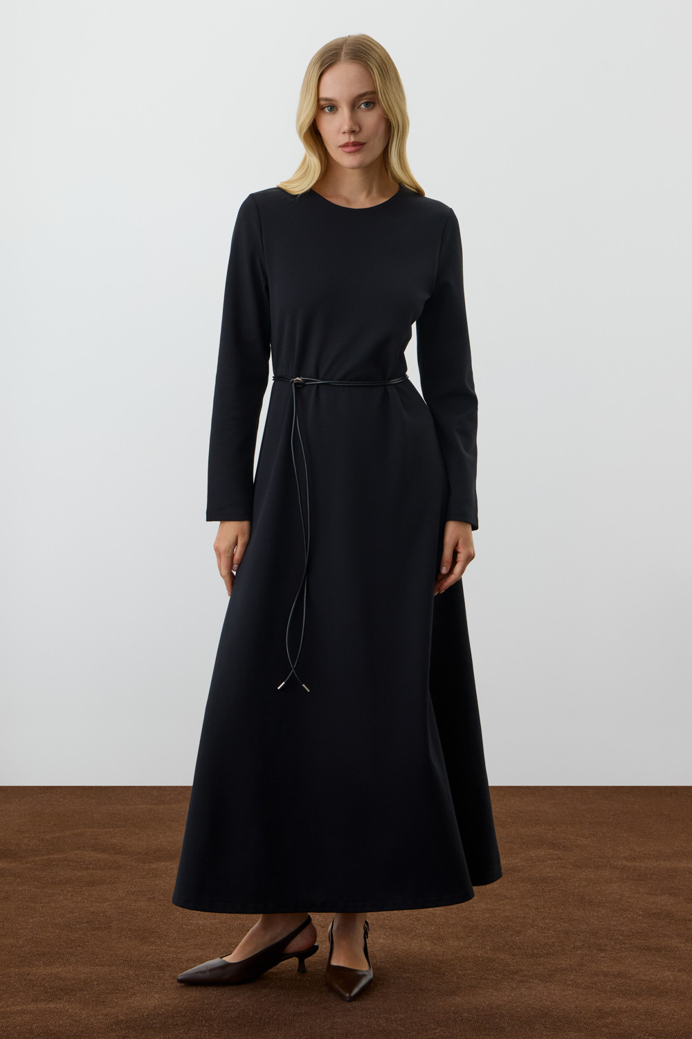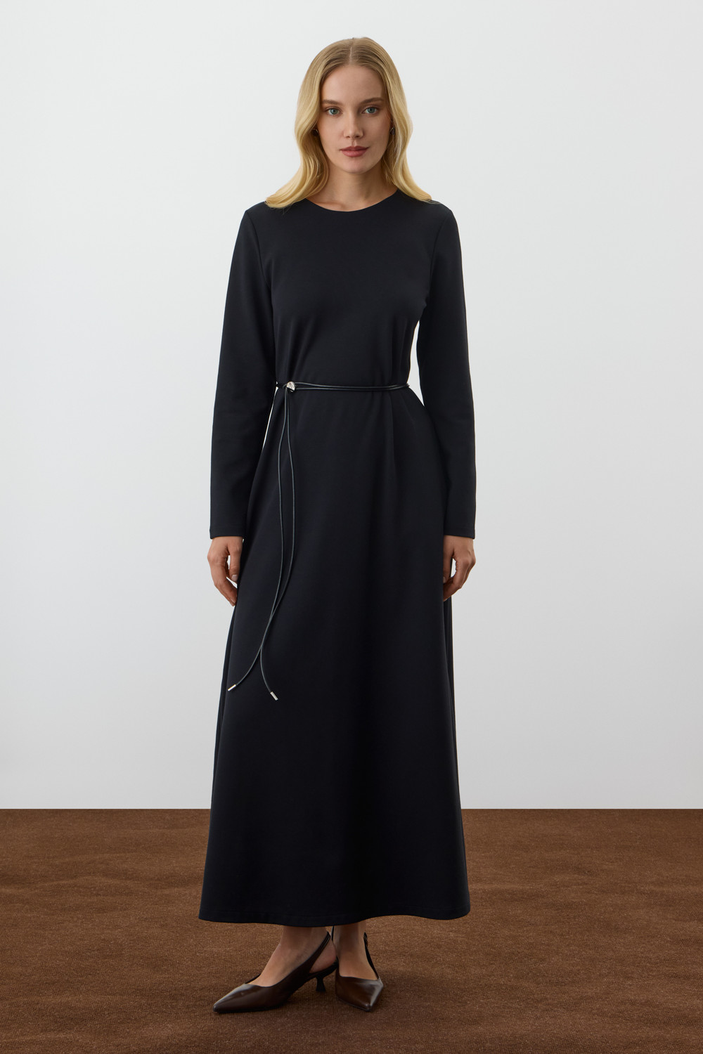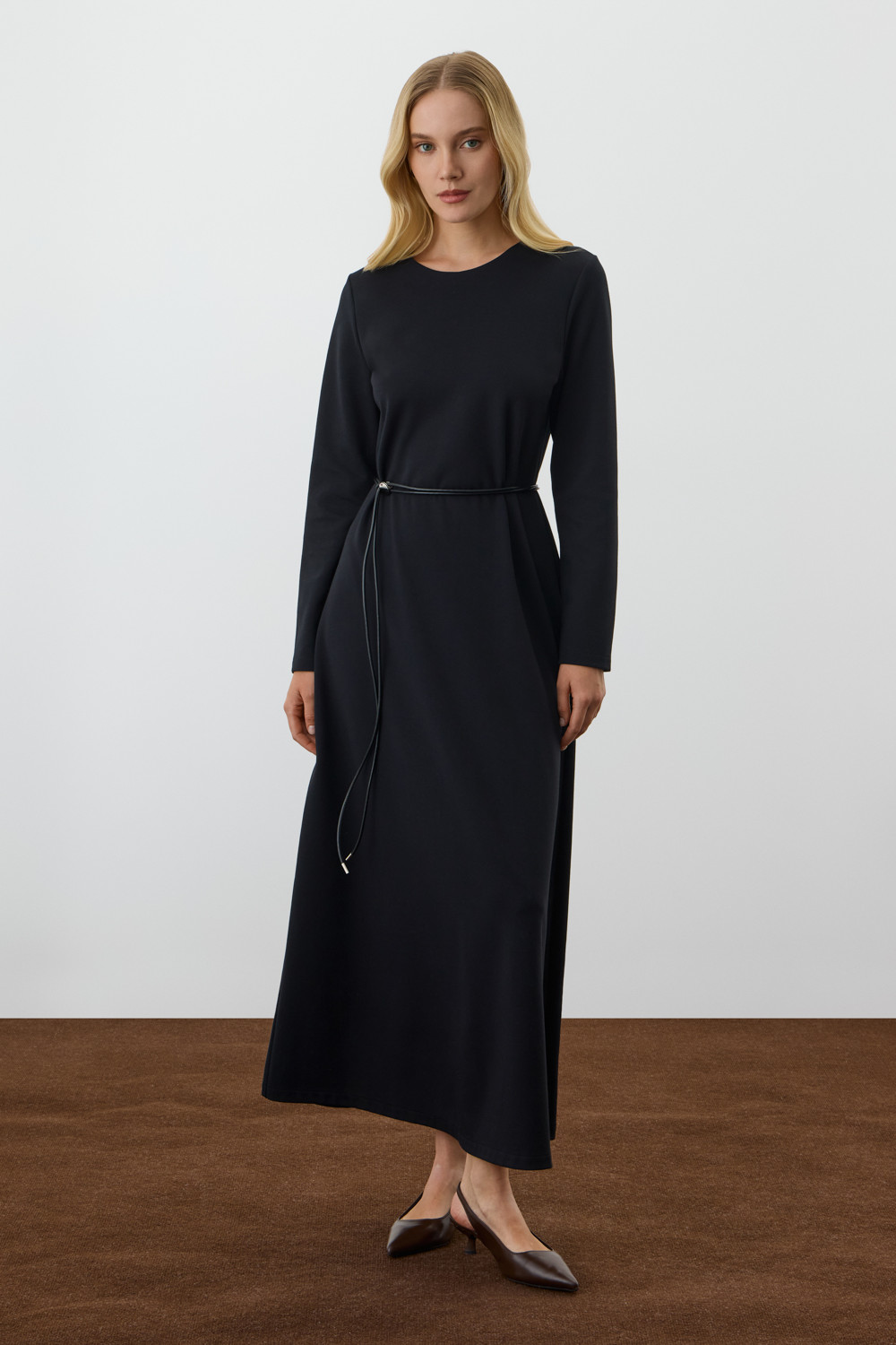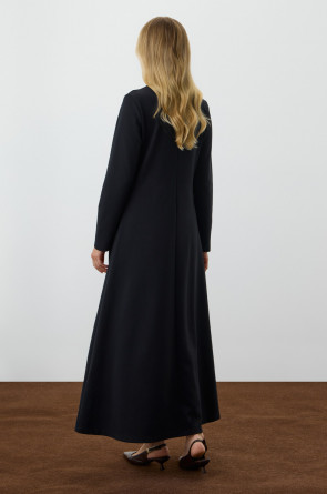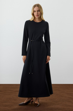Стильное платье с длинными рукавами из премиального трикотажа. Изделиемягко струится к низу для еще большего комфорта движений.