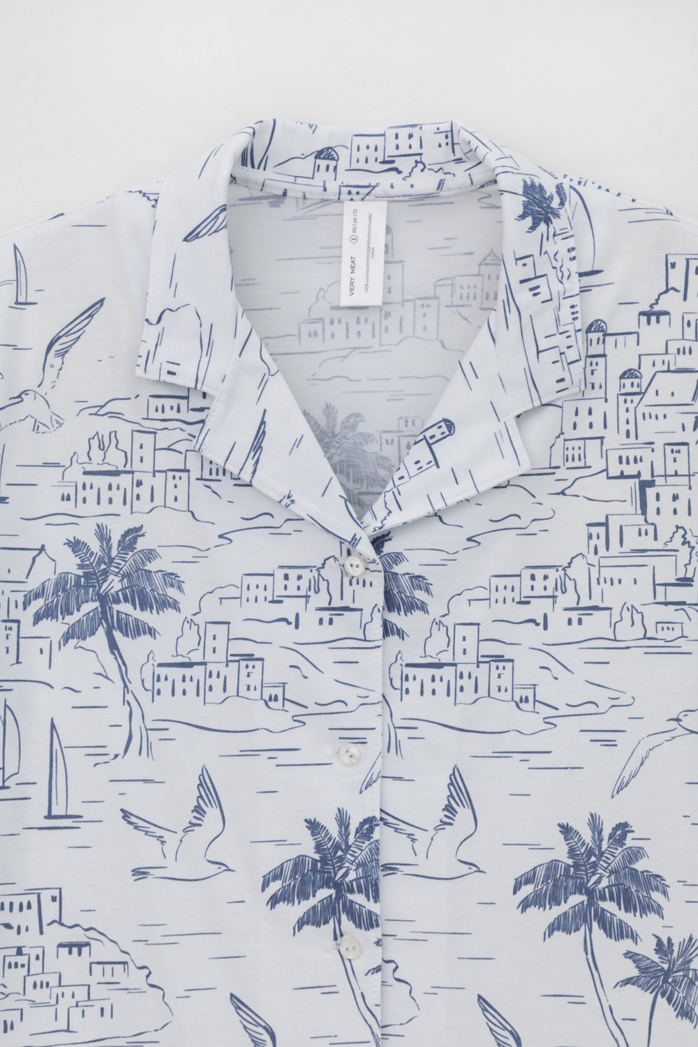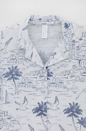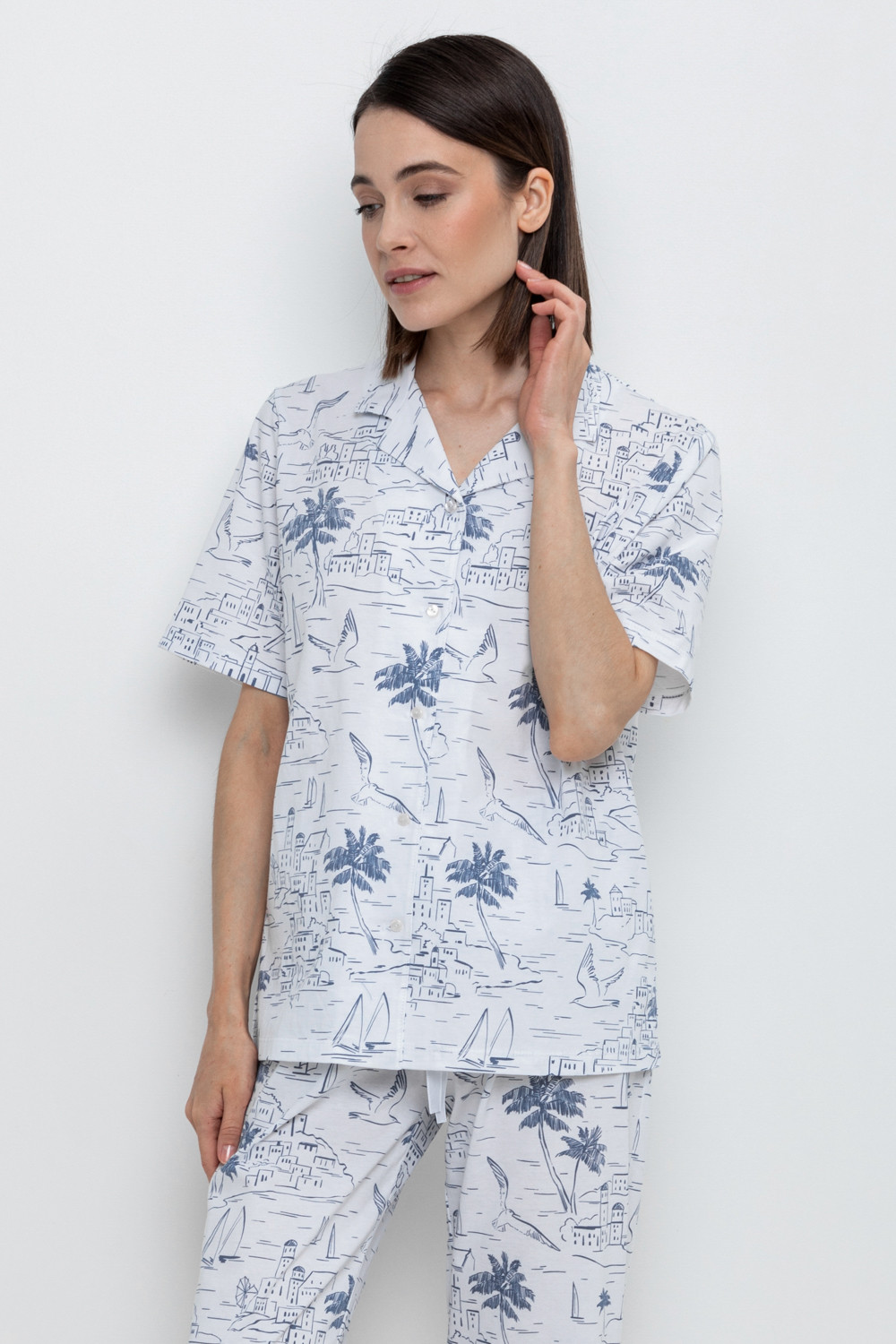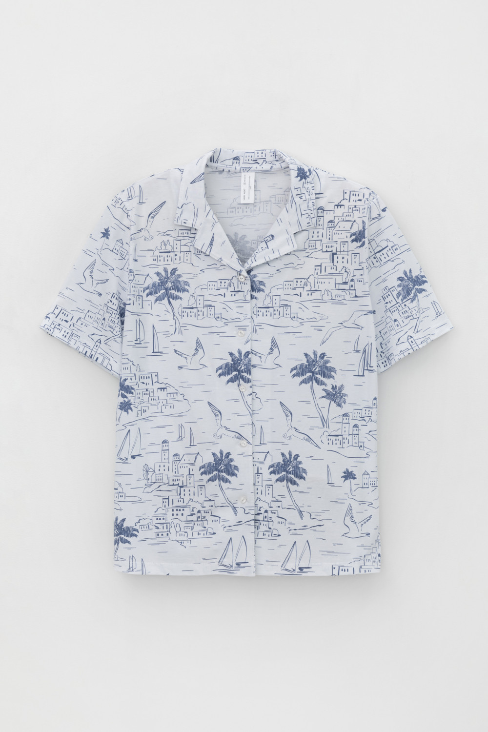 Легкая рубашка с короткими рукавами на пуговицах из набивного трикотажа. Гладкий материал приятен к телу и позволяет коже дышать.