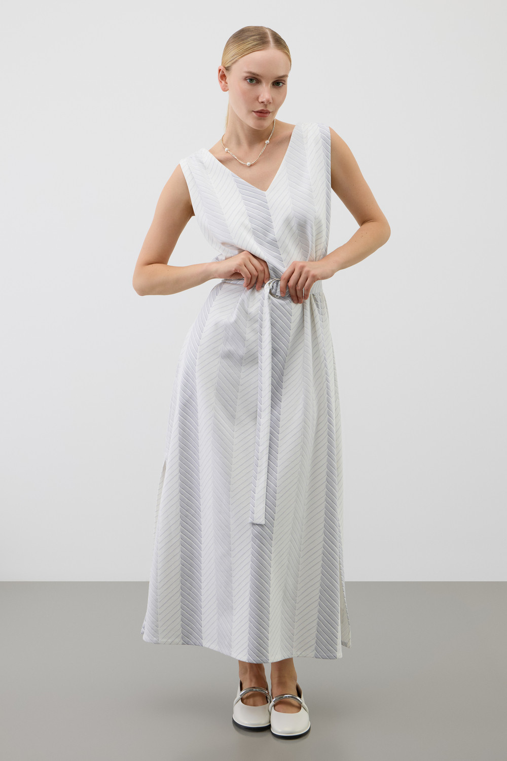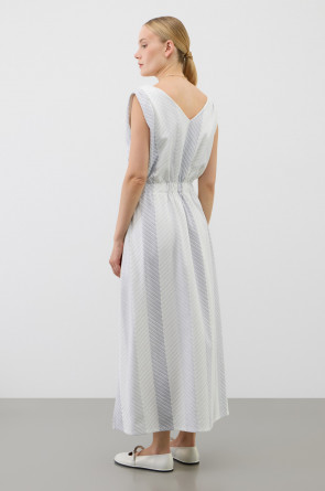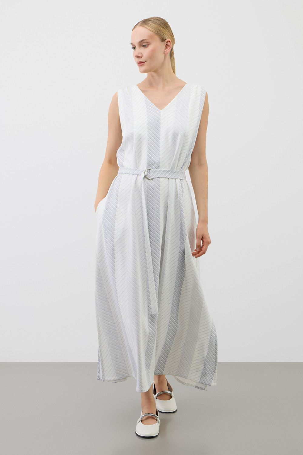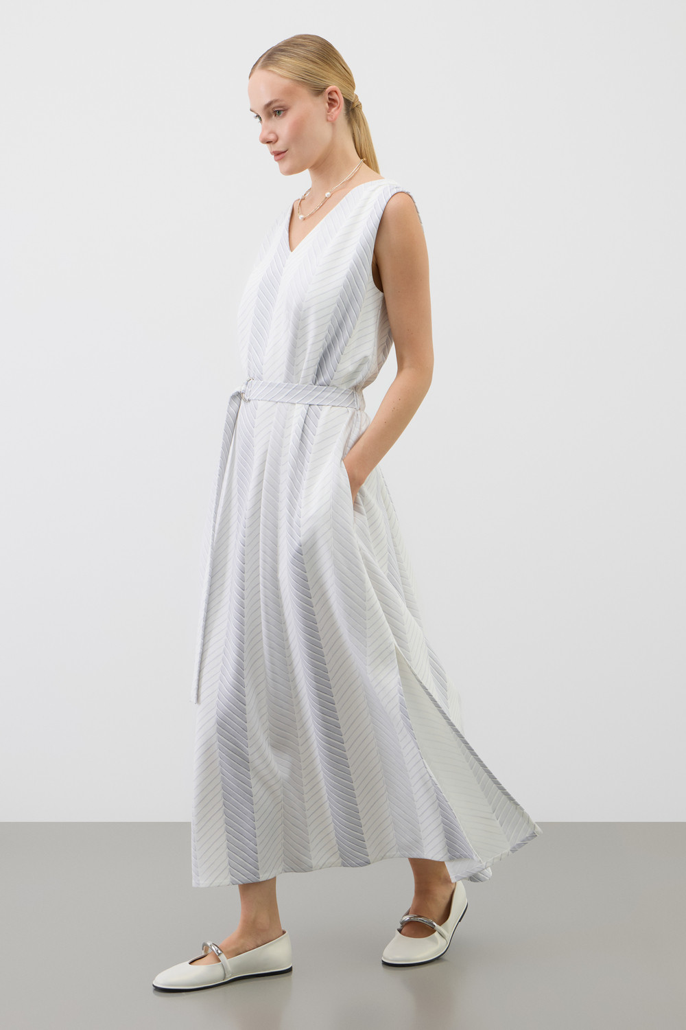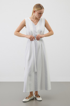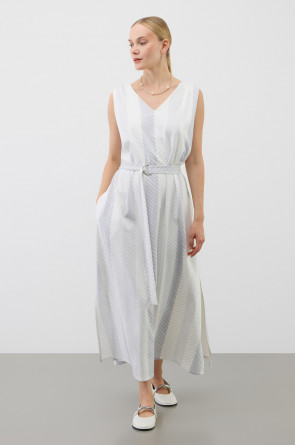 Стильный повседневный сарафан выполнен из премиального хлопка. Наличие пояса и сборок на плечах создает изящный силуэт и подчёркивает талию. Высокие вырезы по бокам дополняют изделие.