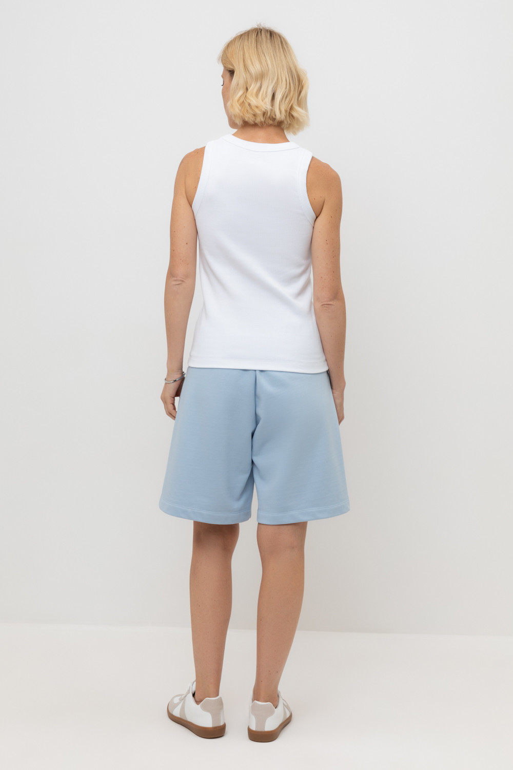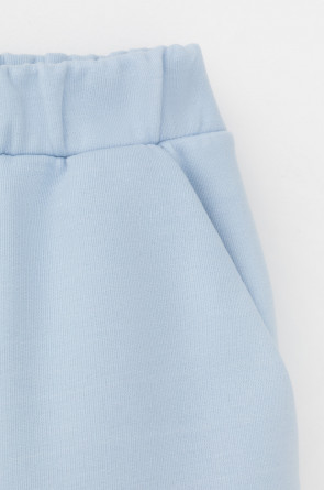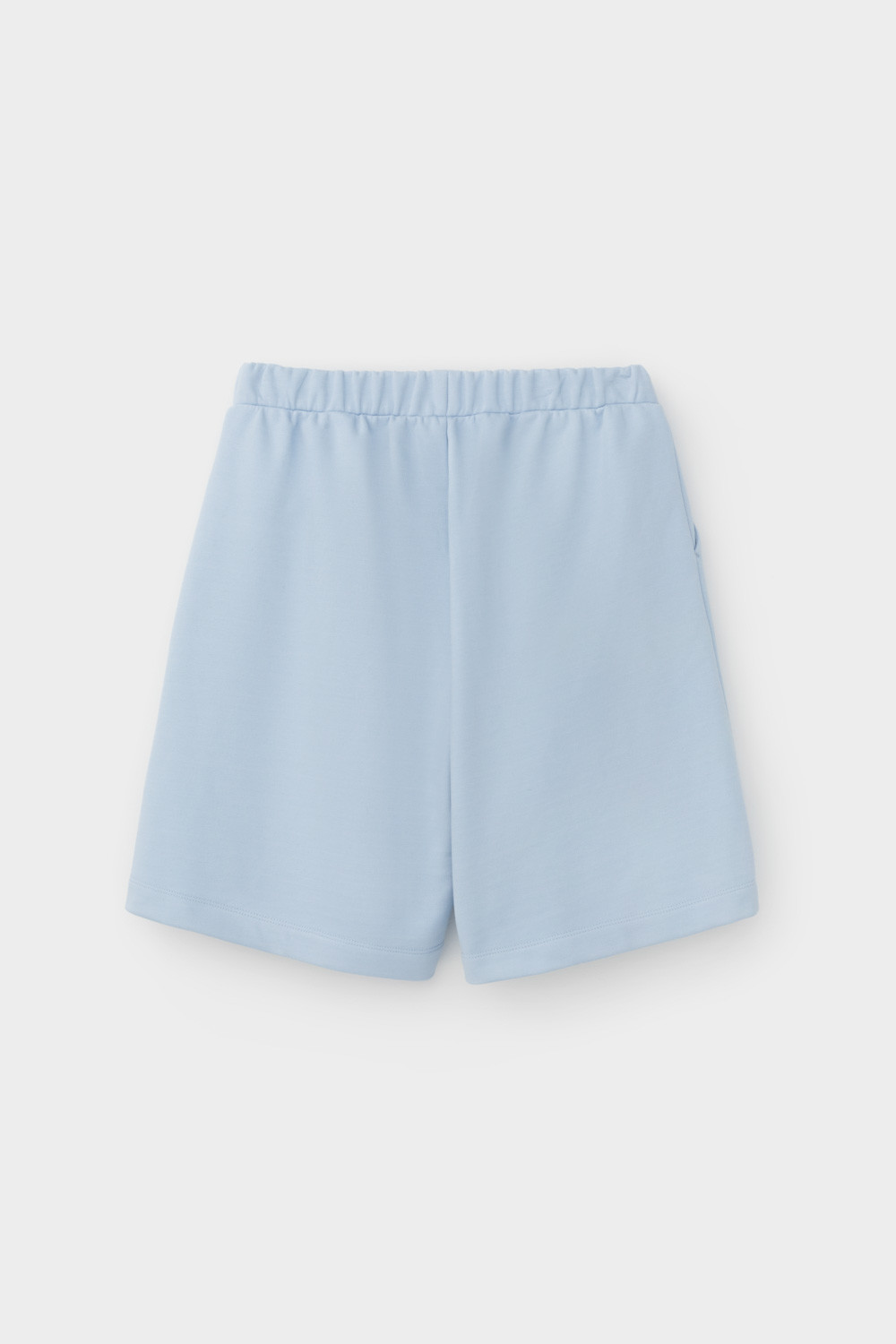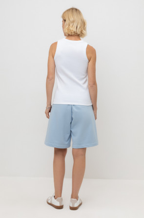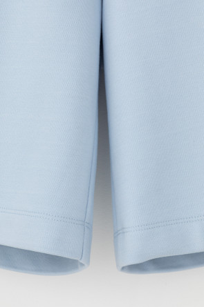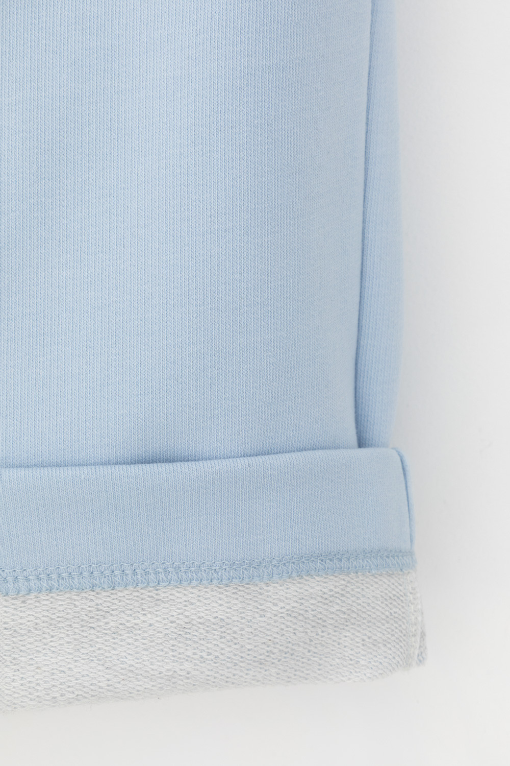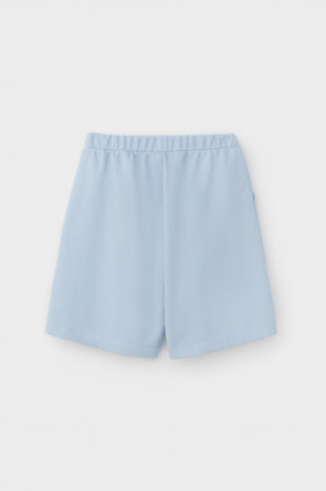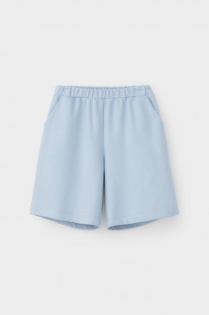 Удлиненные шорты спортивного силуэта из мягкого двухцветного футера. Внутренняя сторона изделия представлена в натуральном цвете хлопка, внешняя в нежно-голубом. За счет использования крашенной пряжи, данный вид полотна прошел минимальную обработку, что придало изделию мягкость и шелковистость.