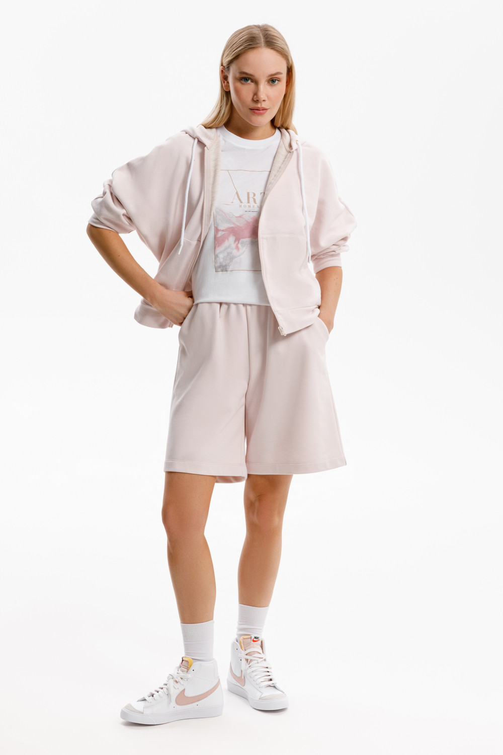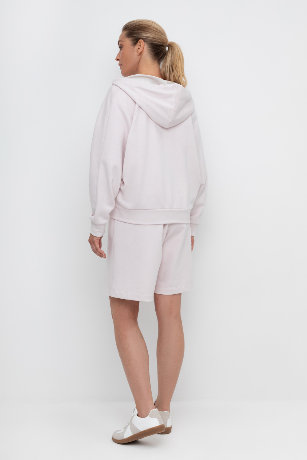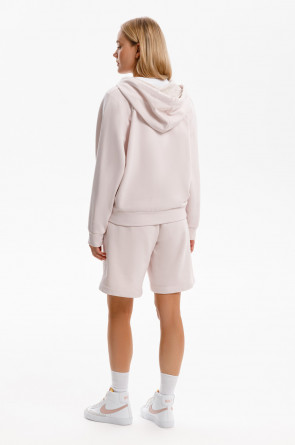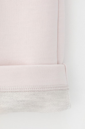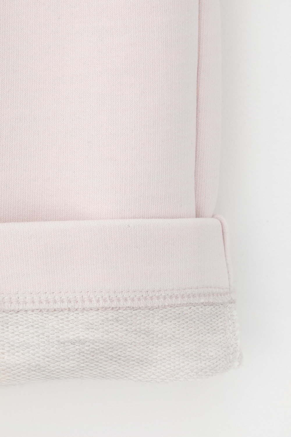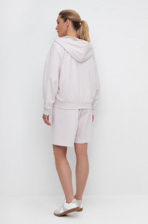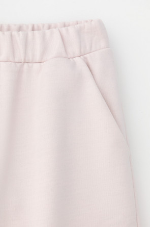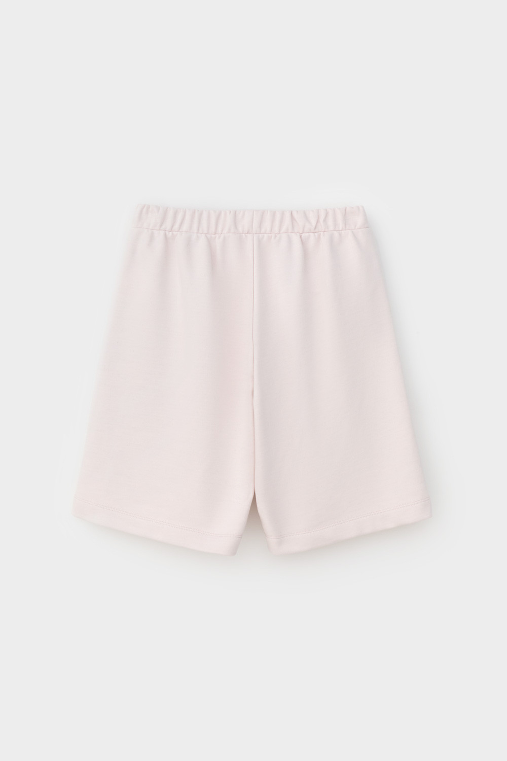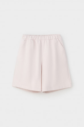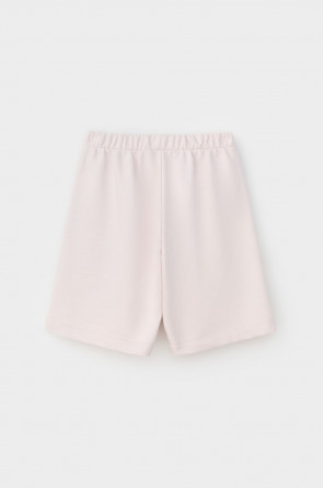 Удлиненные шорты спортивного силуэта из мягкого двухцветного футера. Внутренняя сторона изделия представлена в натуральном цвете хлопка, внешняя в нежно-розовом. За счет использования крашенной пряжи, данный вид полотна прошел минимальную обработку, что придало изделию мягкость и шелковистость.