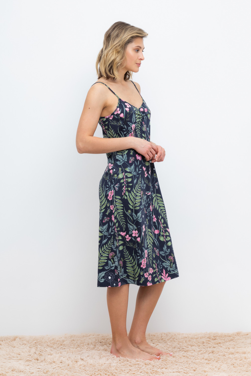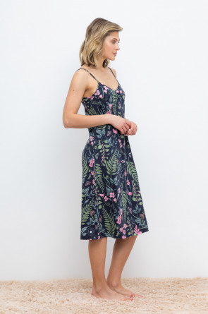 Элегантная сорочка на бретелях из 100% натурального хлопка для комфортного сна. Модель из трикотажного полотна супрем с набивным нежным рисунком с регулируемыми бретелями. На груди сборка. Гладкий материал приятен к телу и позволяет коже дышать.