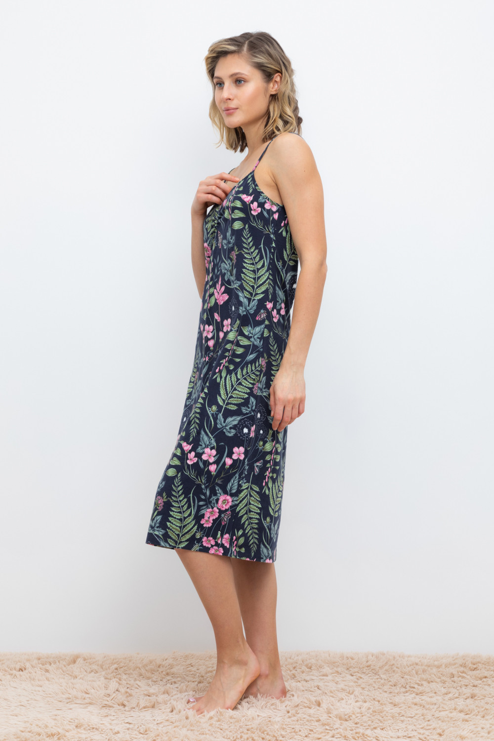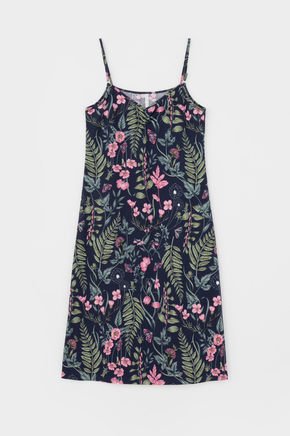Элегантная сорочка на бретелях из 100% натурального хлопка для комфортного сна. Модель из трикотажного полотна супрем с набивным нежным рисунком с регулируемыми бретелями. На груди сборка. Гладкий материал приятен к телу и позволяет коже дышать.