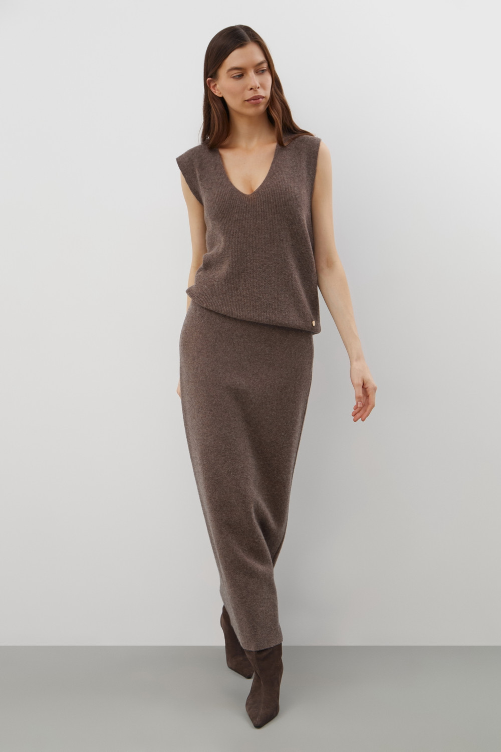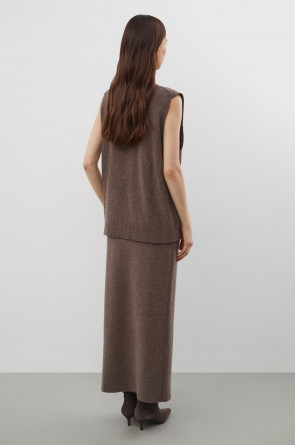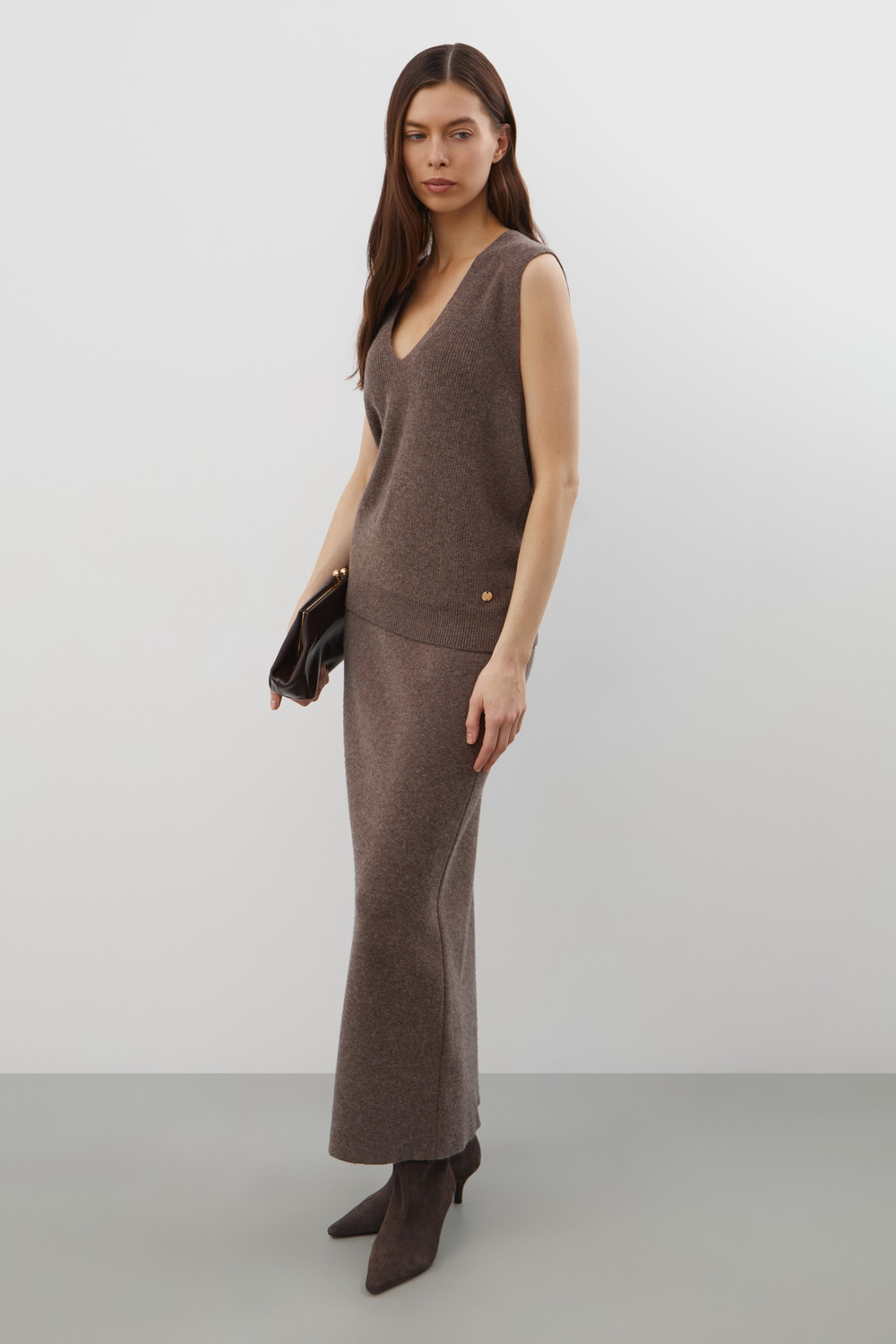 Элегантная юбка, изготовленная из высококачественной пряжи мериноса в сочетании с кашемиром и вискозой. Модель деликатно подчеркивает силуэт, обеспечивает нежное прикосновение к коже и сохраняет безупречный внешний вид.