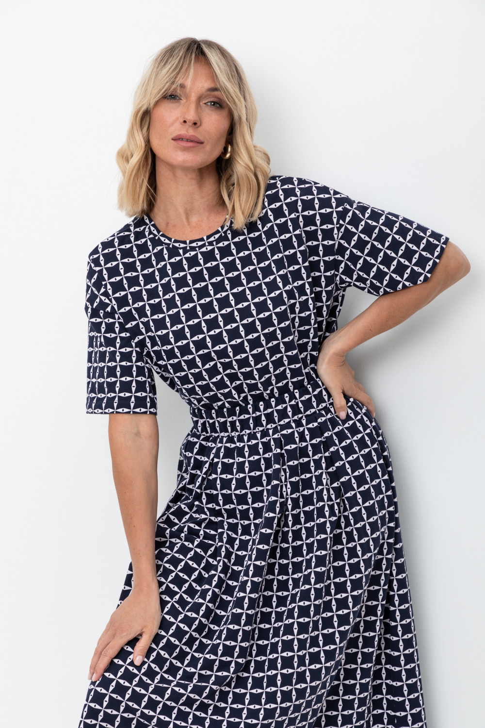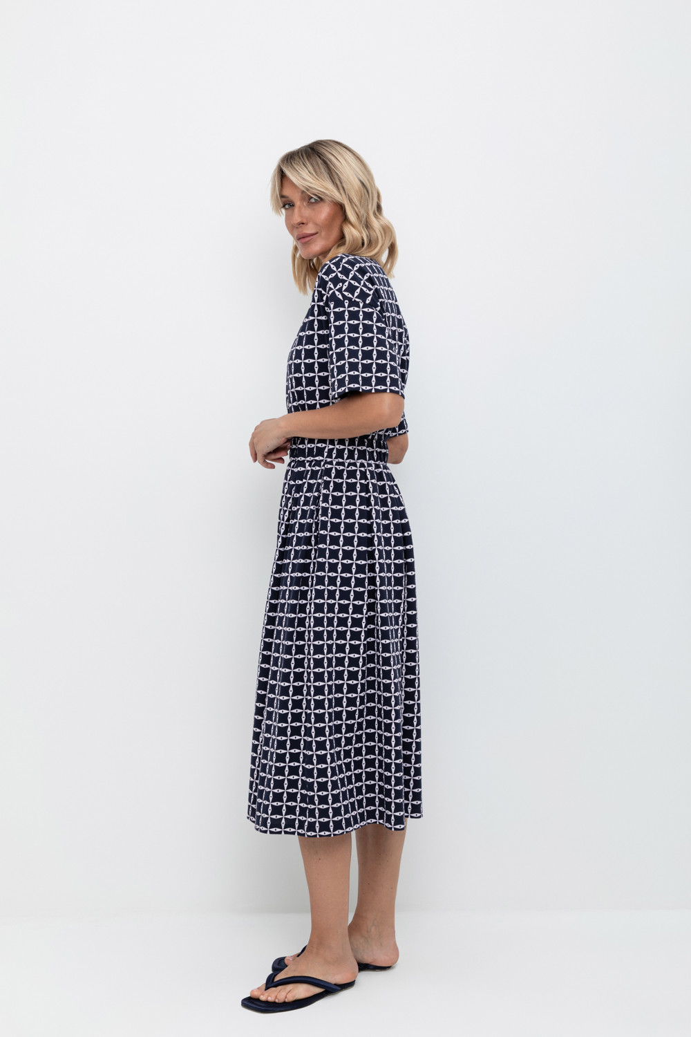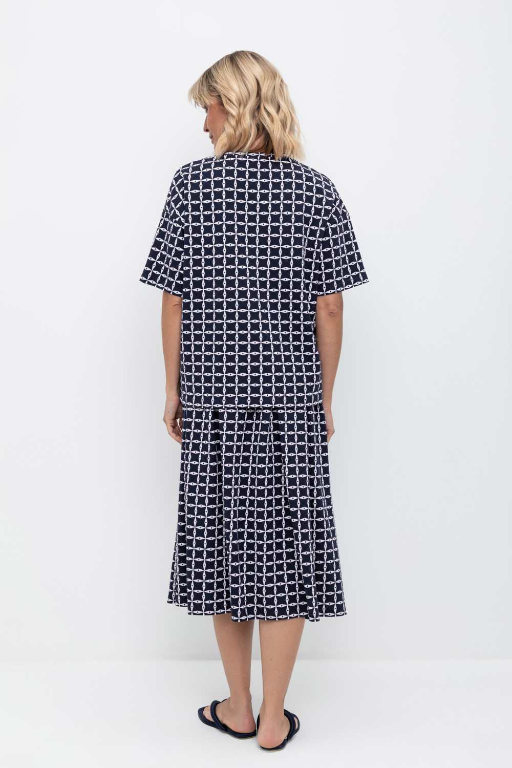Юбка миди из набивного пике с широкими мягкими складками и боковыми карманами.