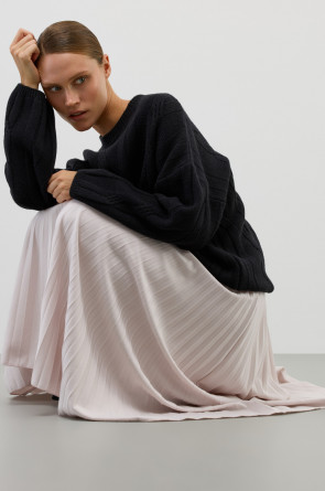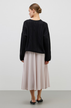 Юбка гофре, выполненная из высококачественного трикотажного полотна DOUBLE FACE, отличается особой легкостью и шелковистой текстурой благодаря силиконовой обработке ткани. Она элегантно струится, создавая ощущение легкости и воздушности. Мелкие складки визуально удлиняют силуэт, подчеркивая женственность.