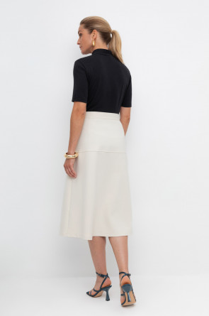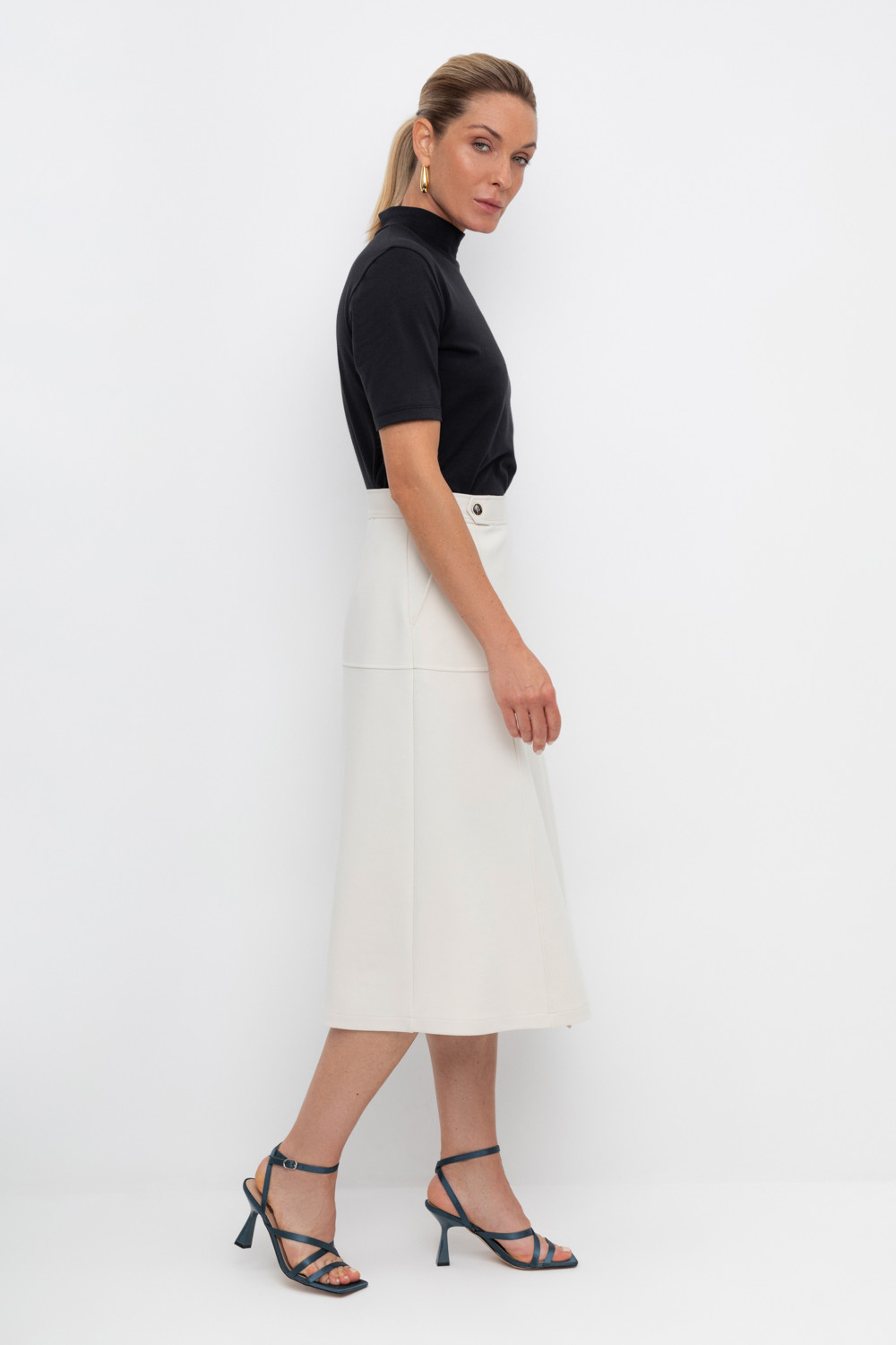 Юбка с акцентной линией талии подчеркивает утонченный силуэт. Длина миди добавляет образу сдержанной классики, делая изделие универсальным для любого случая, а имитации запаха не создает лишний объём. Юбка изготовлена из премиального трикотажа DOUBLE FACE.