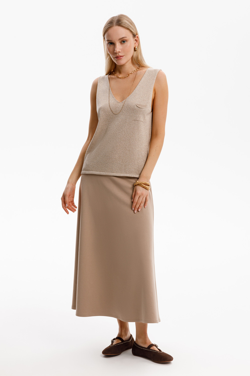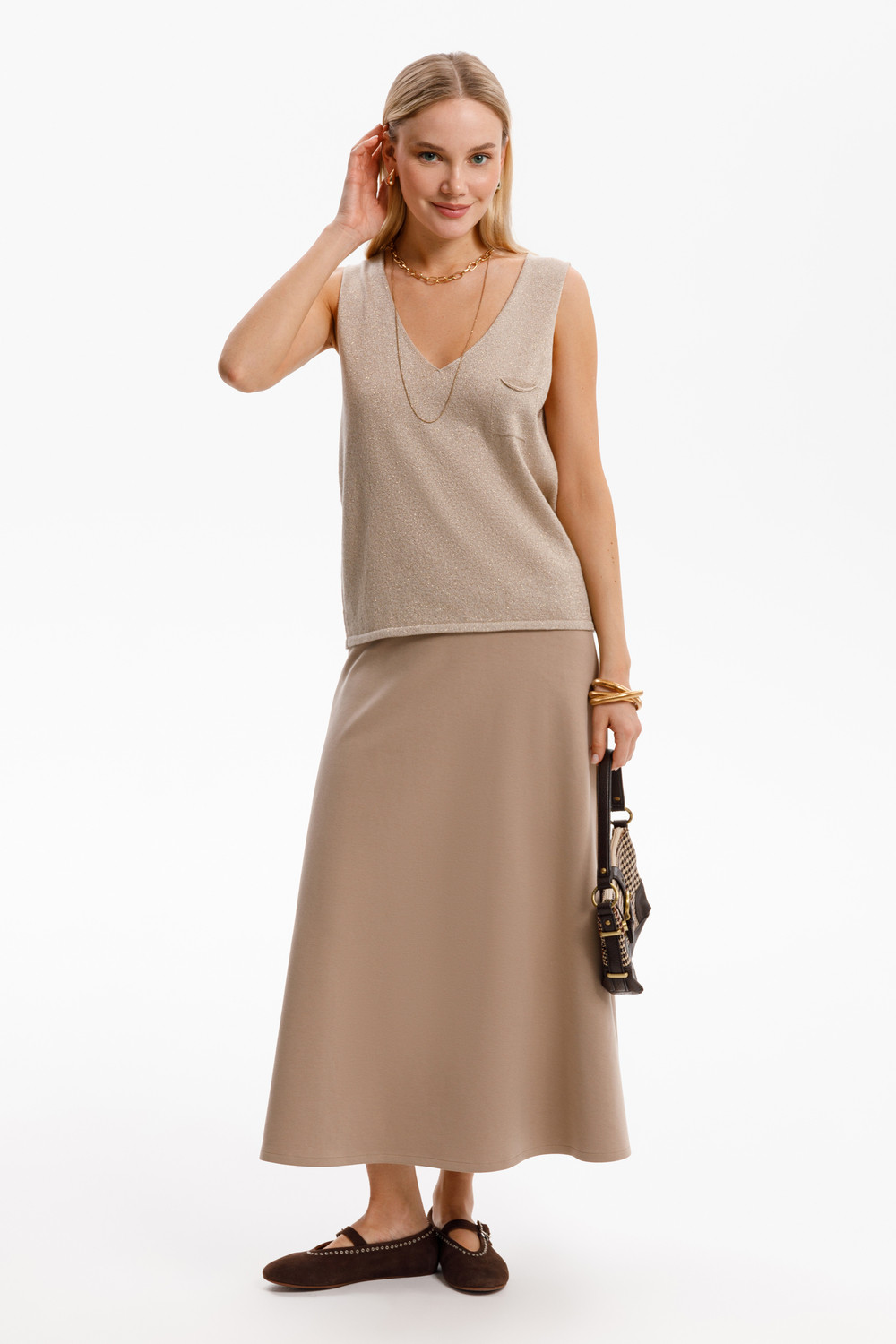 Удлиненная юбка расклешенного силуэта, изготовлена из премиального трикотажного полотна DOUBLE FACE с добавлением спандекса. Мягкий на ощупь трикотаж выполнен из высококачественной гребенной пряжи. Мягкий пояс с эластичной резинкой внутри придает изделию функциональность и комфорт.