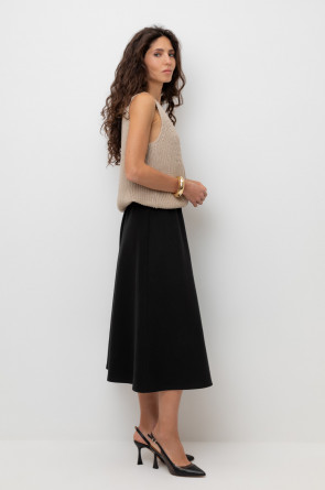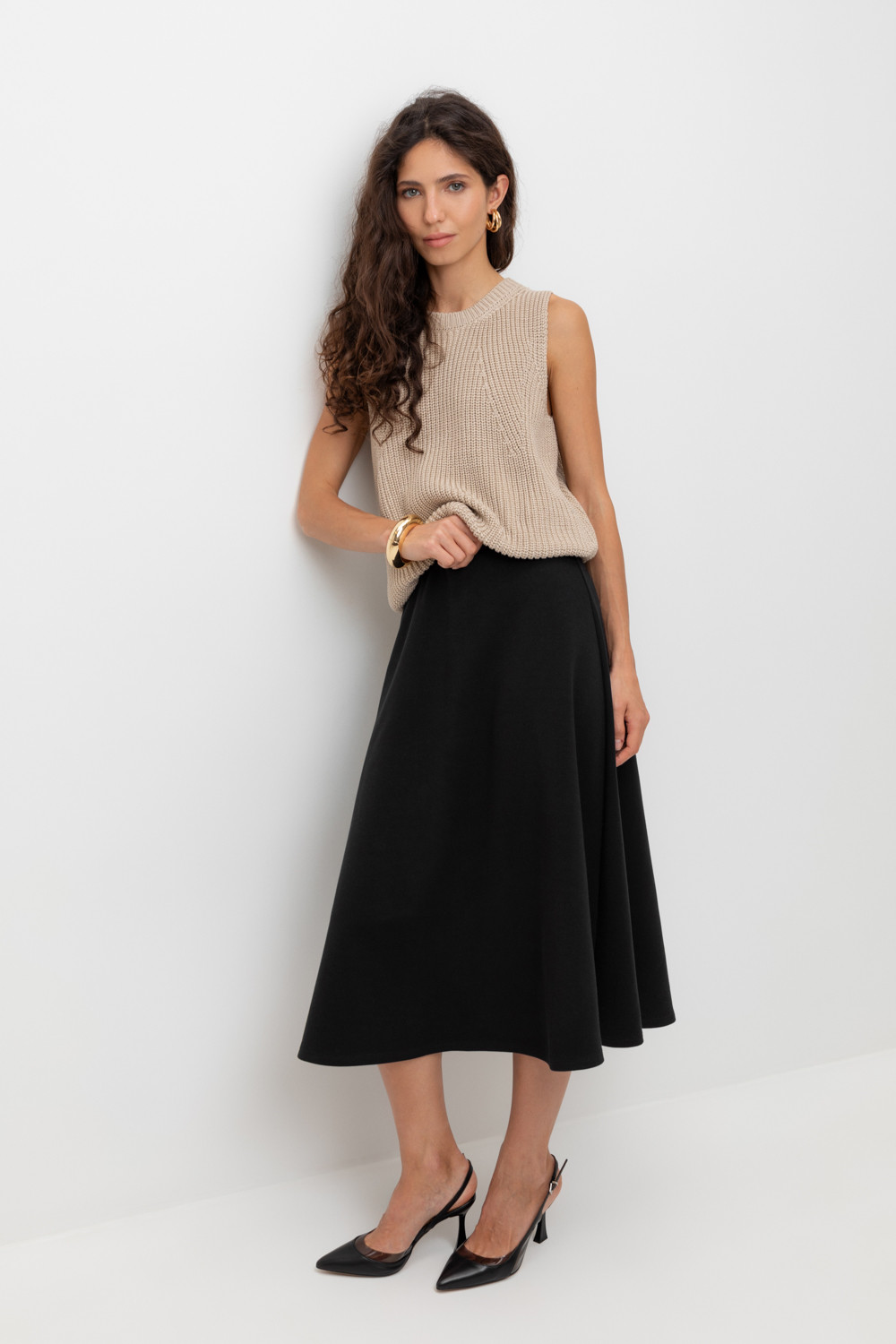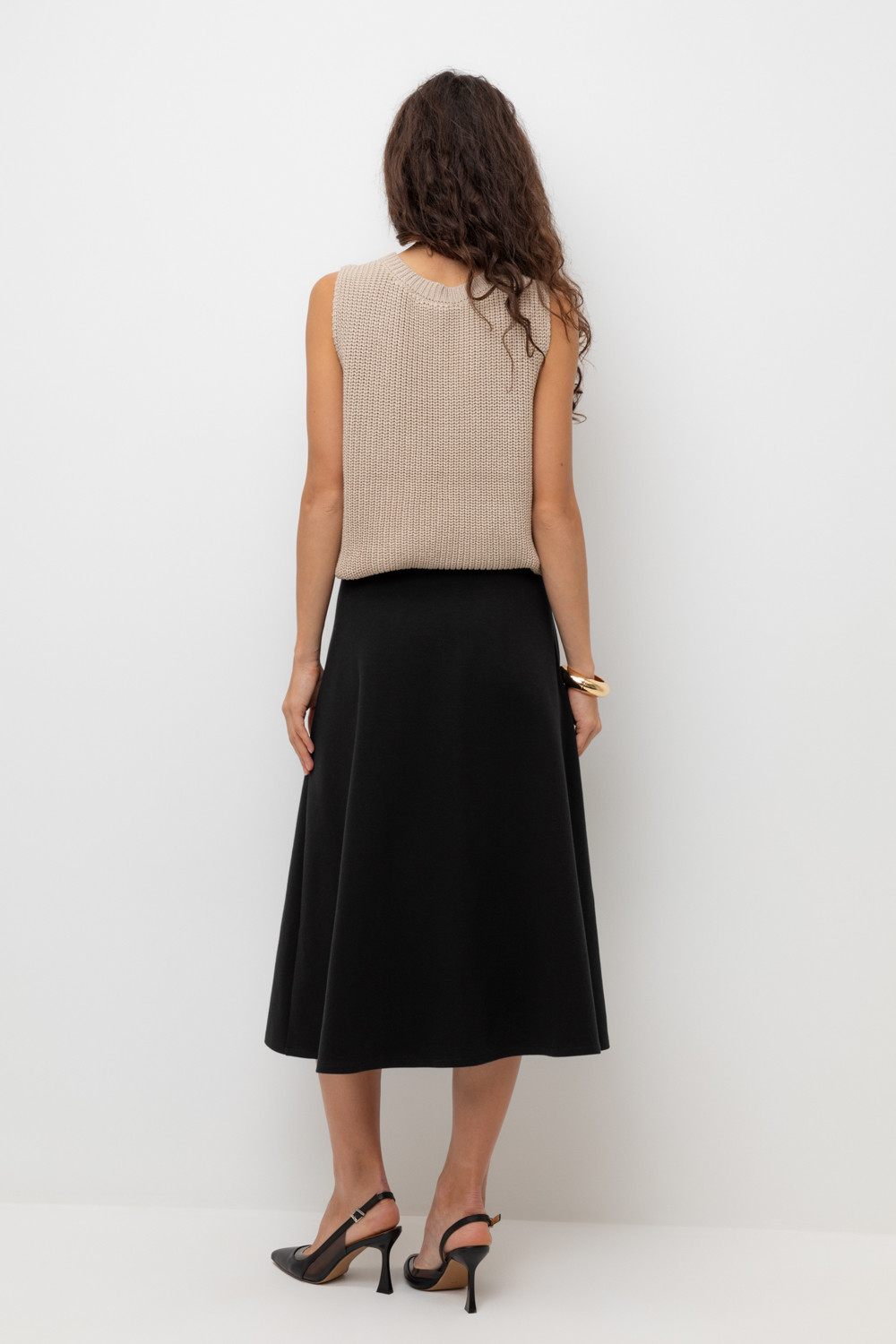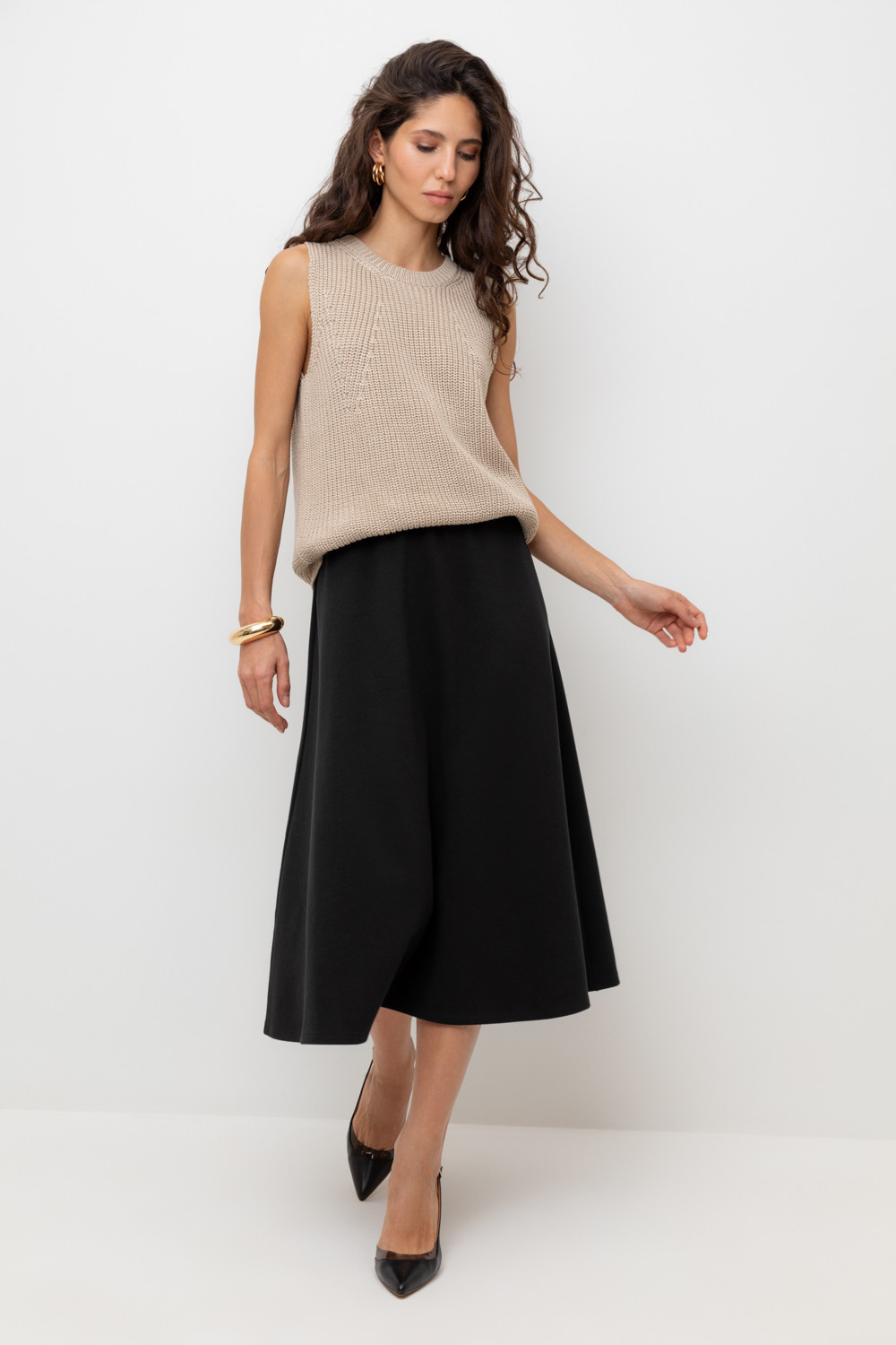 Удлиненная юбка расклешенного силуэта, изготовлена из премиального трикотажного полотна DOUBLE FACE с добавлением спандекса. Мягкий на ощупь трикотаж выполнен из высококачественной гребенной пряжи. Мягкий пояс с эластичной резинкой внутри придает изделию функциональность и комфорт.