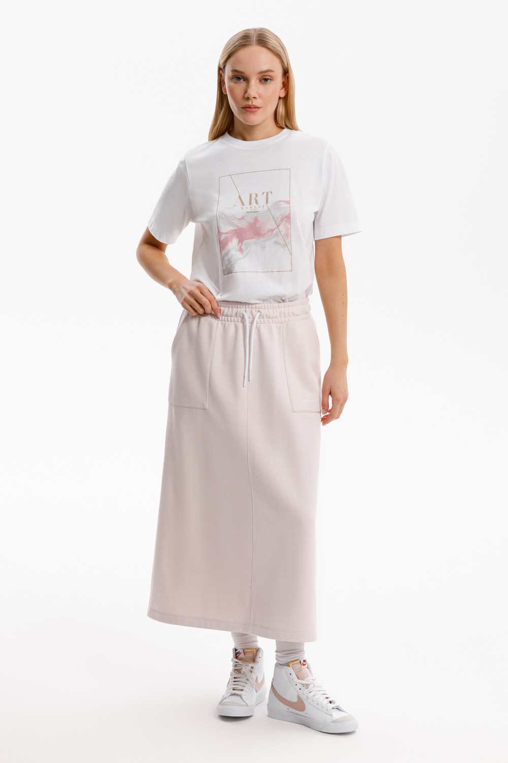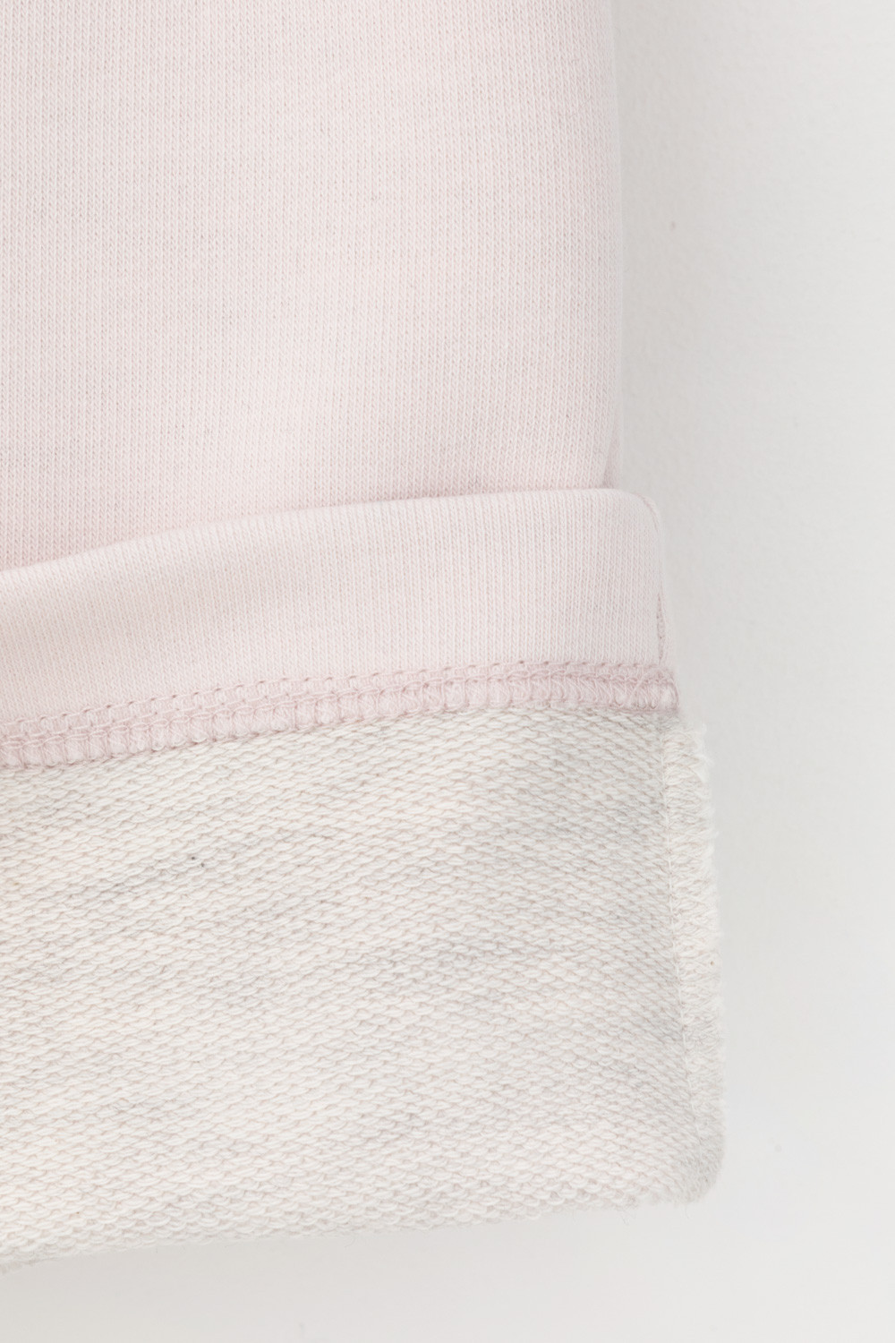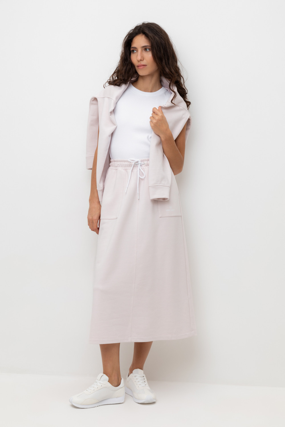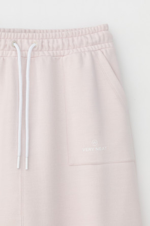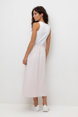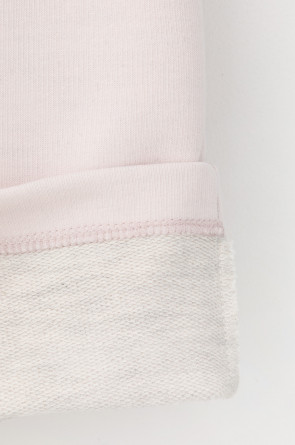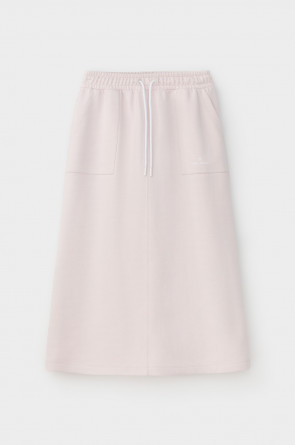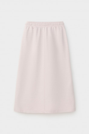 Юбка спортивного силуэта из мягкого двухцветного футера. Внутренняя сторона изделия представлена в натуральном цвете хлопка, внешняя в нежно-розовом. За счет использования крашенной пряжи, данный вид полотна прошел минимальную обработку, что придало изделию мягкость и шелковистость.