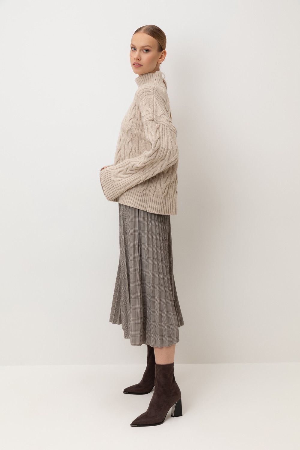 Юбка гофре, выполненная из высококачественного трикотажного полотна DOUBLE FACE, отличается особой легкостью и шелковистой текстурой благодаря силиконовой обработке ткани. Она элегантно струится, создавая ощущение легкости и воздушности. Мелкие складки визуально удлиняют силуэт, подчеркивая женственность.