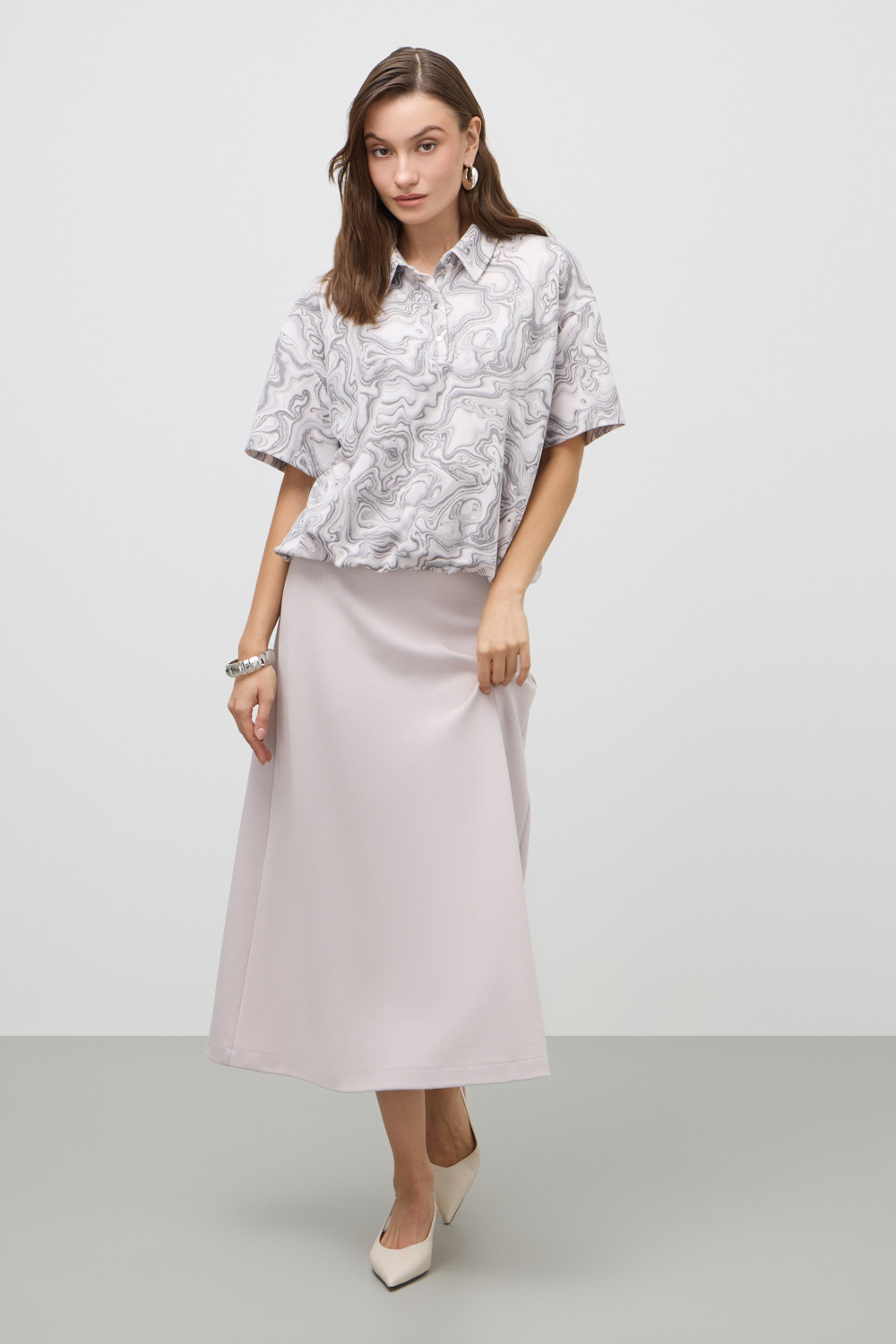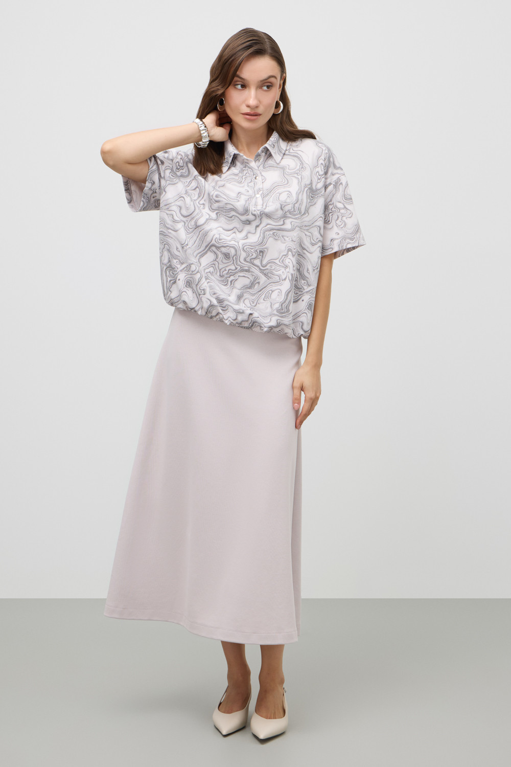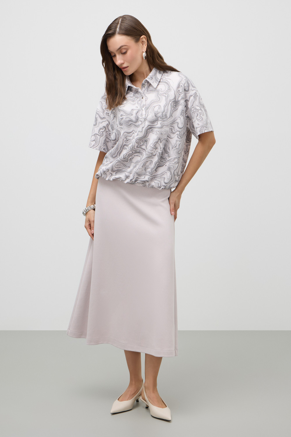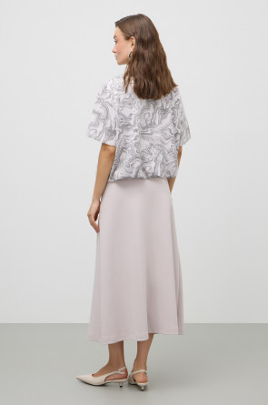 Юбка мягко струится, создавая изящный объём и подчёркивая талию. Расширяясь к низу, юбка отражает легкость и воздушность.