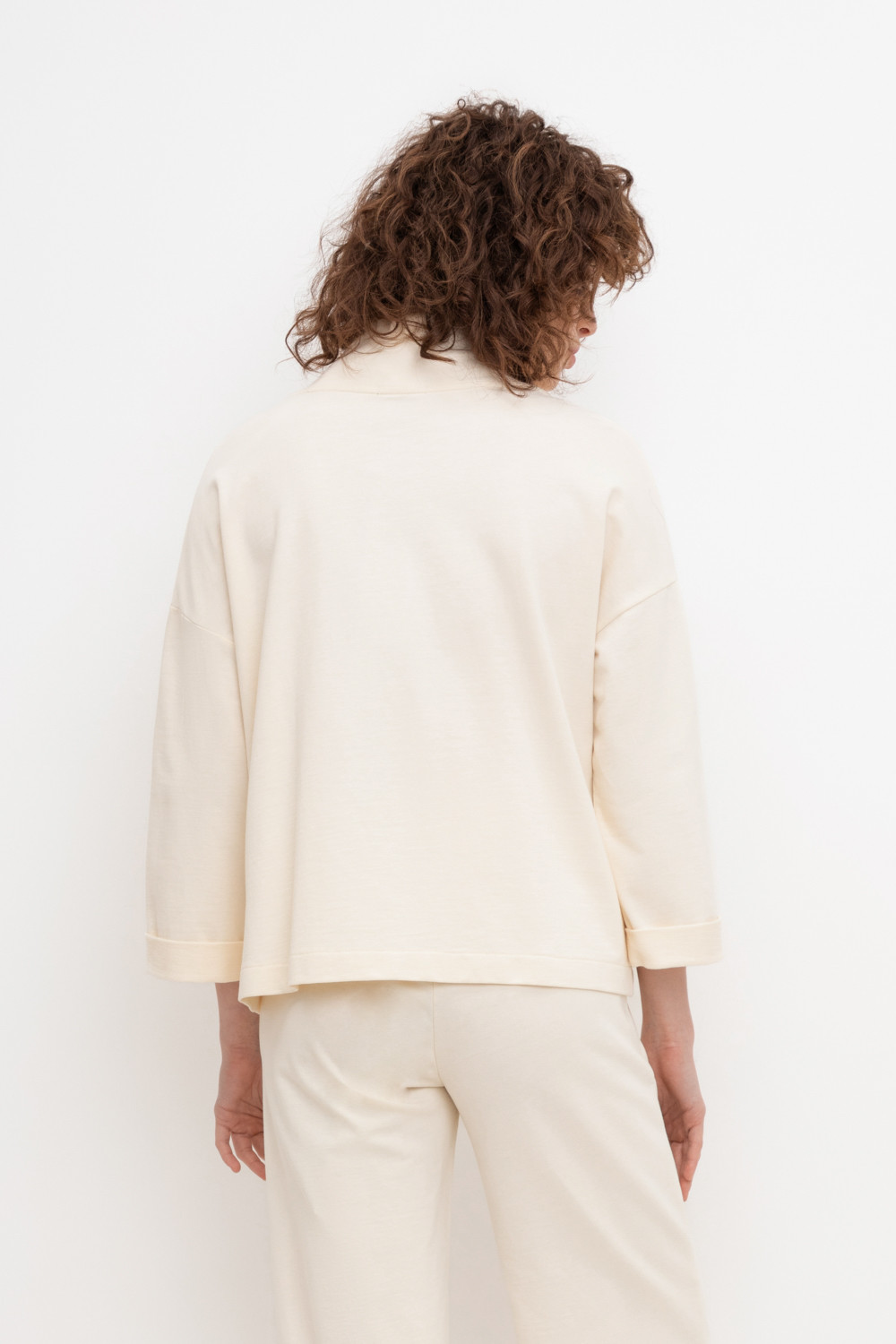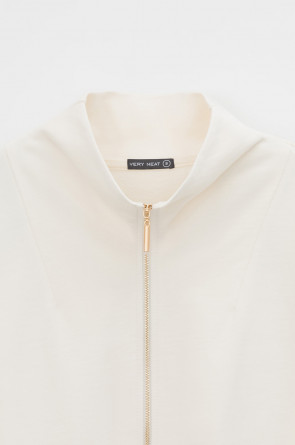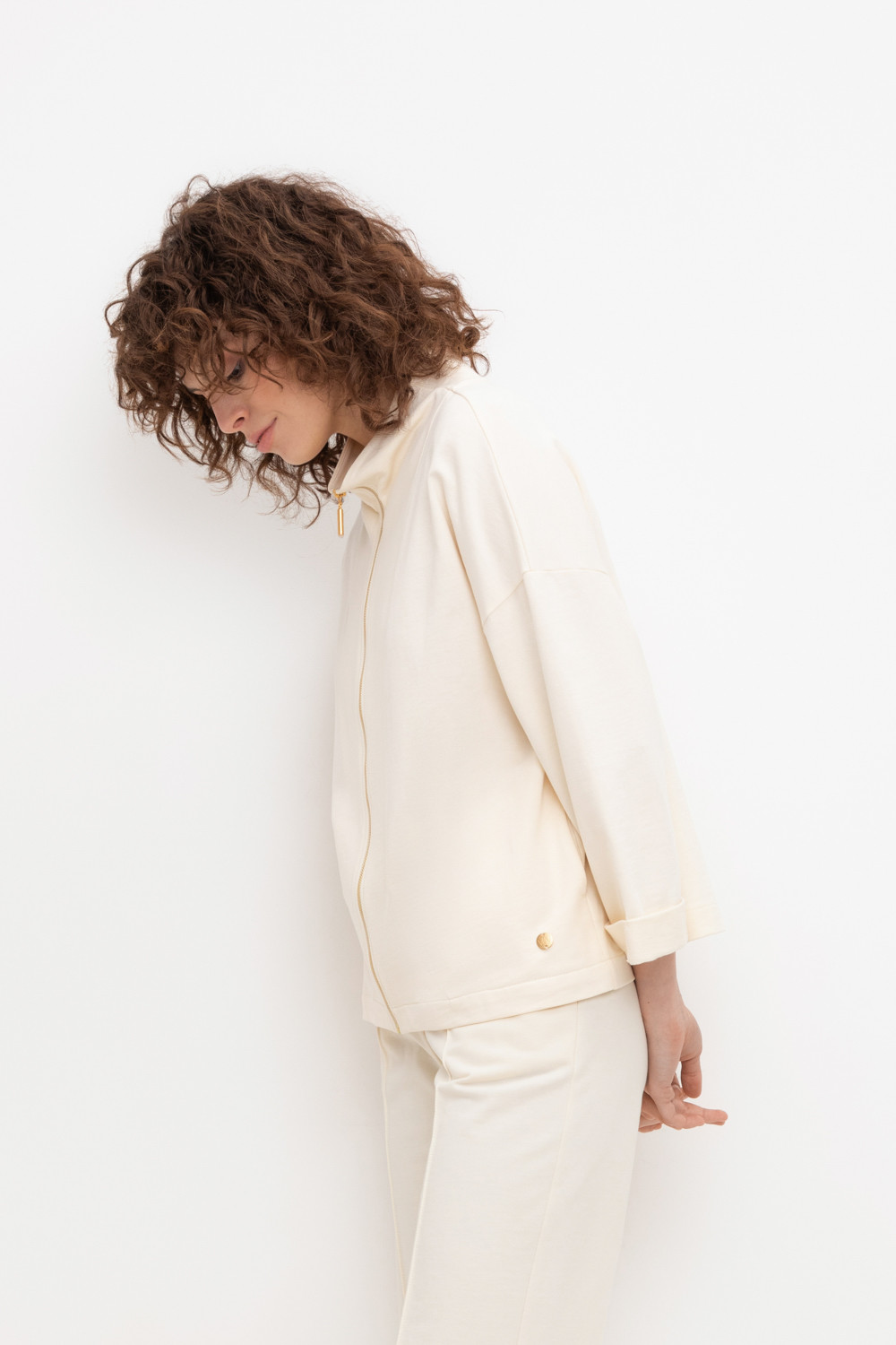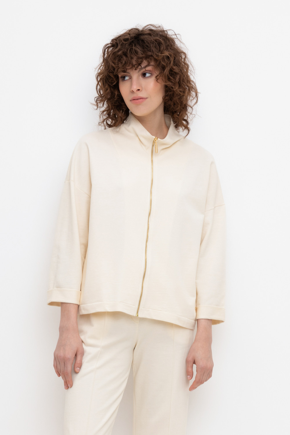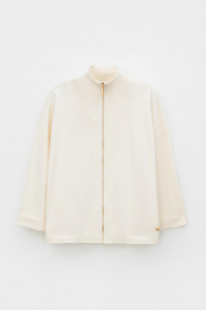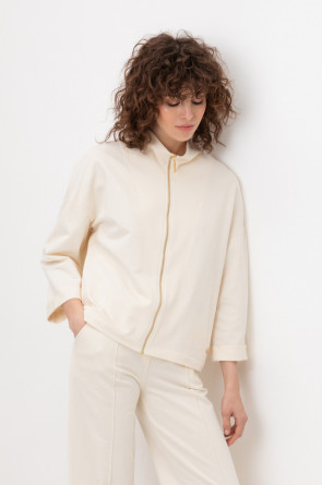Укороченная трикотажная куртка на молнии с карманами и высоким воротником-стойкой. Произведена из мягкого трикотажного футера с эластаном. Спущенные рукава добавляют объем.