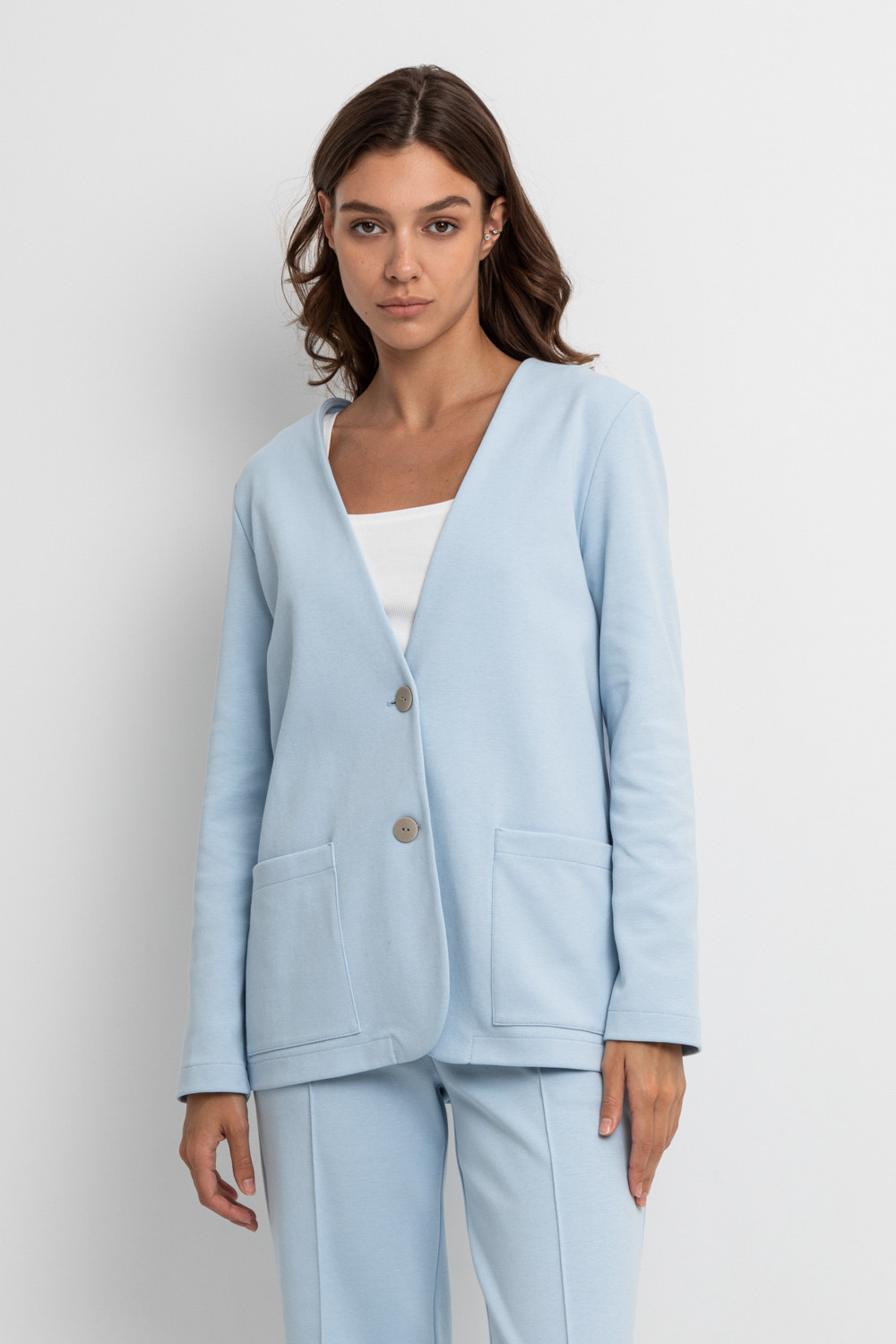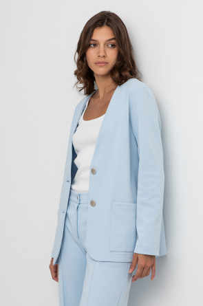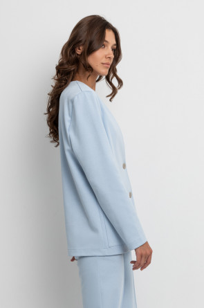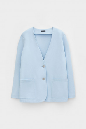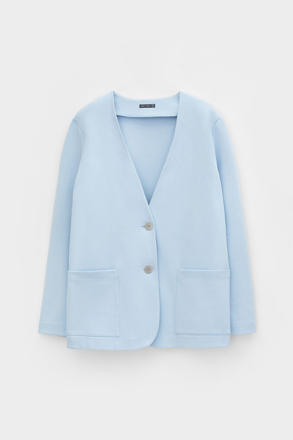 Однобортный, прямой немного удлиненный жакет с застежкой на пуговицы и двумя накладными карманами из плотного гладкого трикотажа интерлок. Все трикотажные изделия производятся в соответствии с нормами Швейцарского сертификата ЭкоТекс. Сделано в России