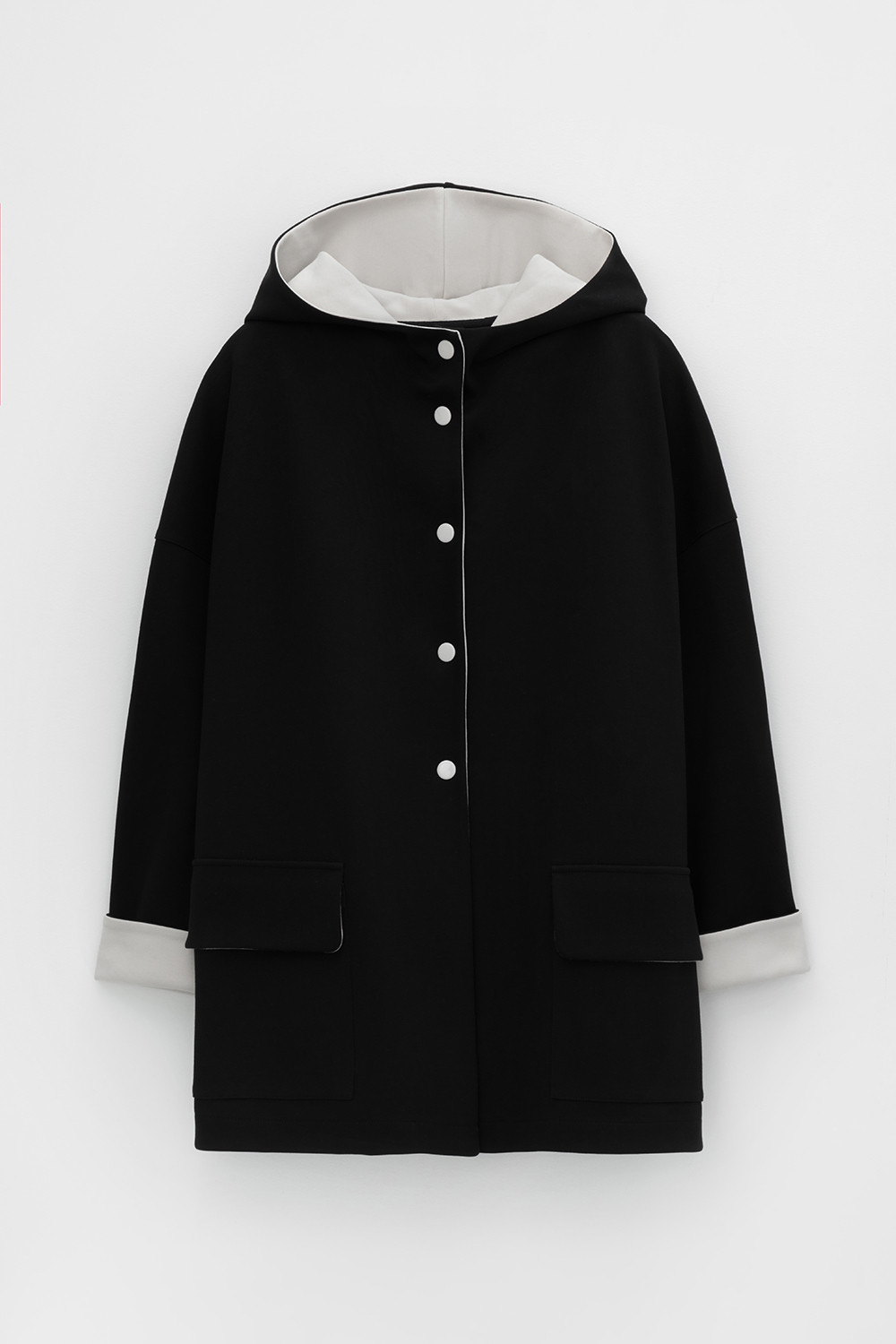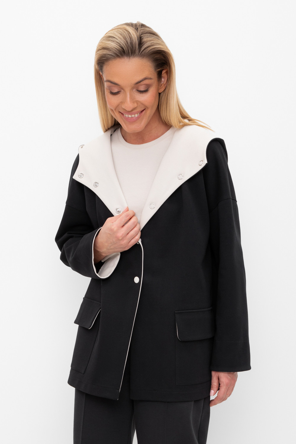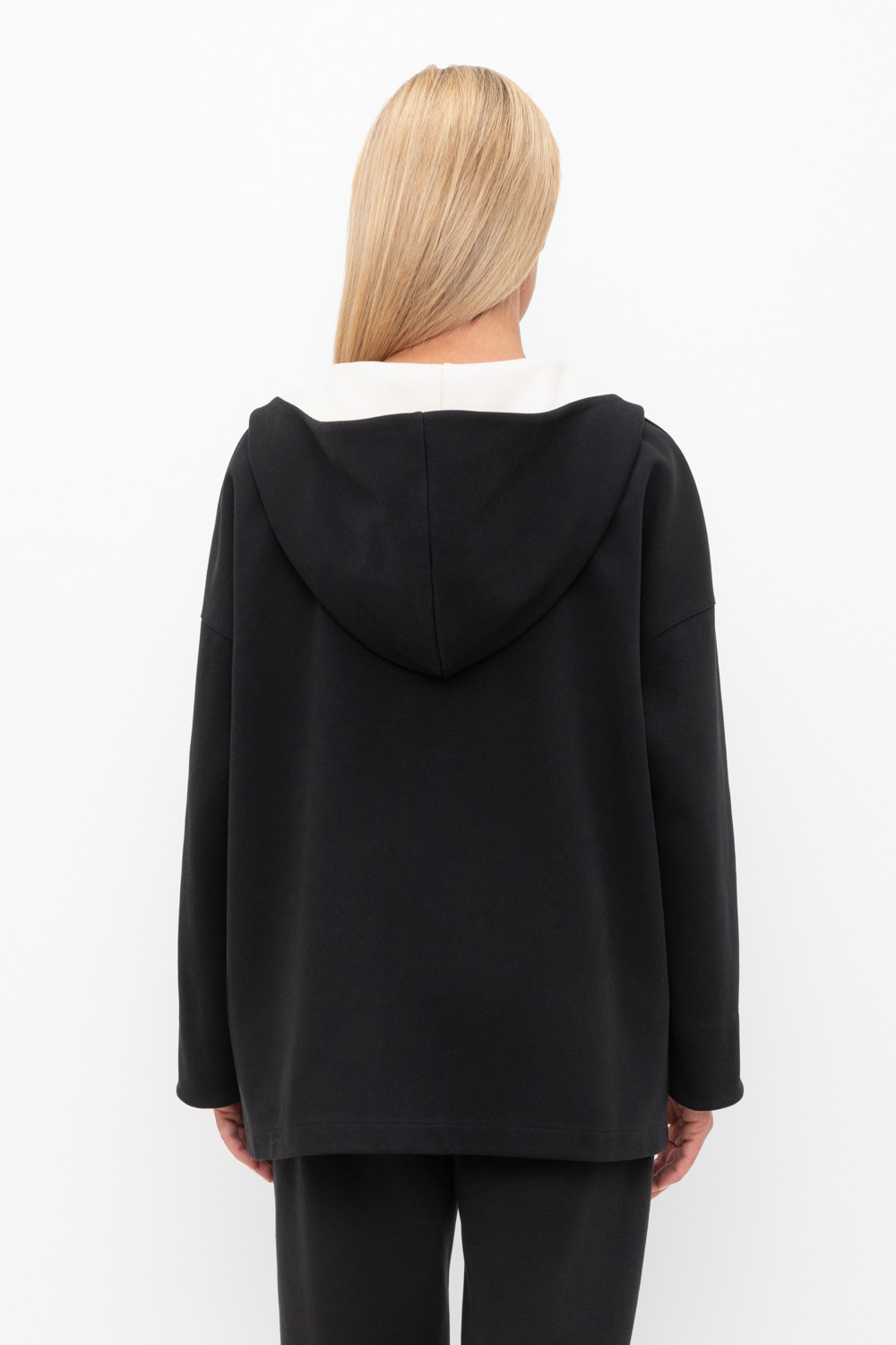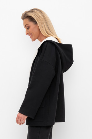 Женская куртка с капюшоном из плотного гладкого трикотажа интерлок со спандексом. Свободная модель с накладными карманами. Гладкий и плотный материал на основе хлопка сохраняет форму.