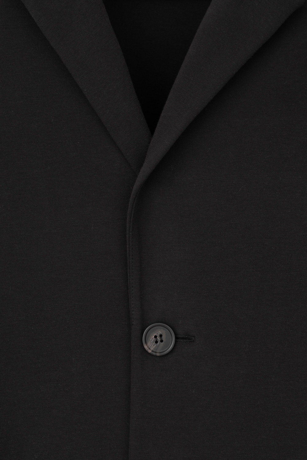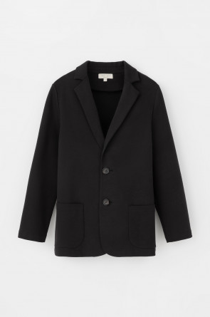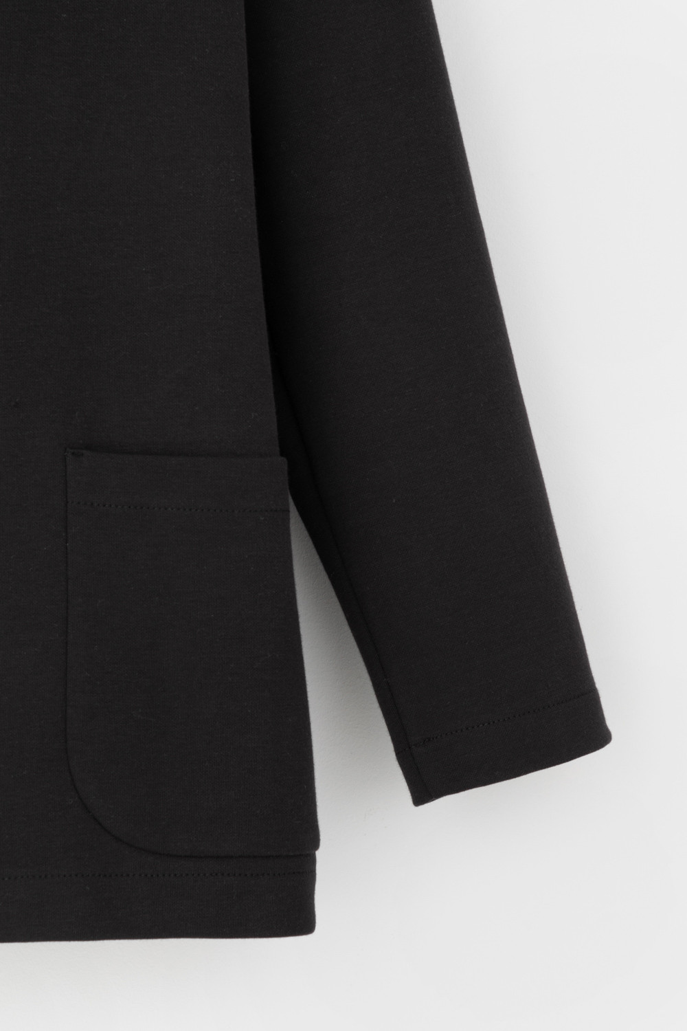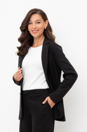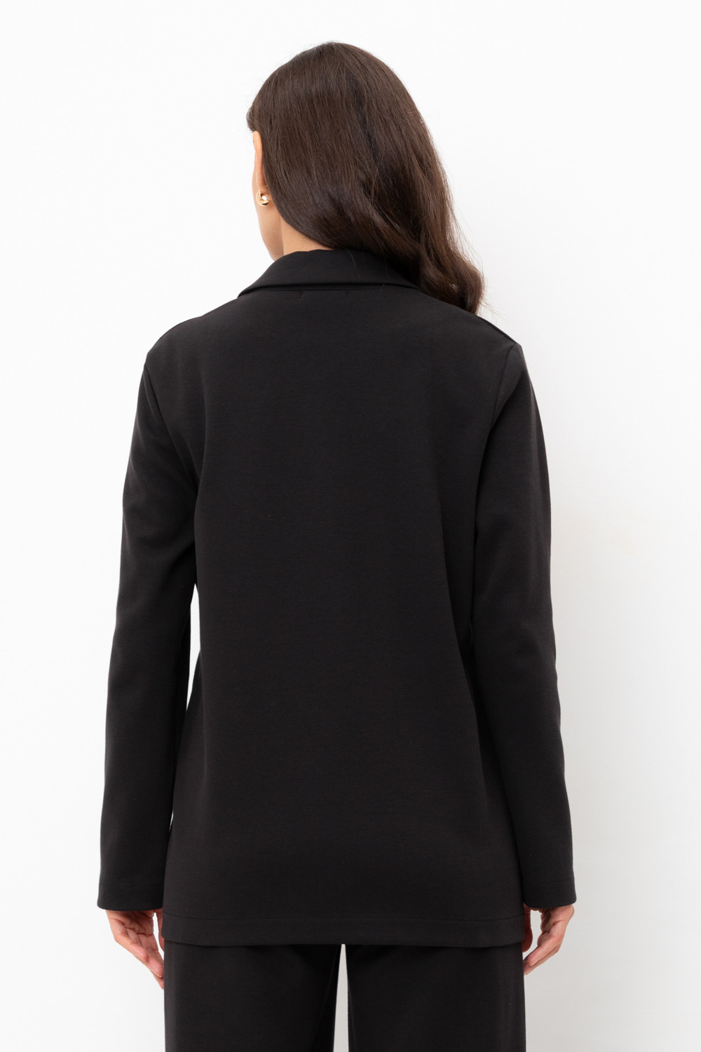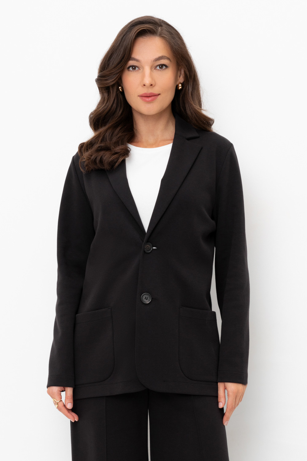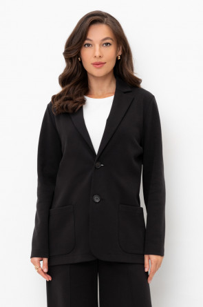 Женский жакет с карманами прямого кроя с застежкой на пуговицы и двумя накладными карманами из плотного гладкого трикотажа интерлок.