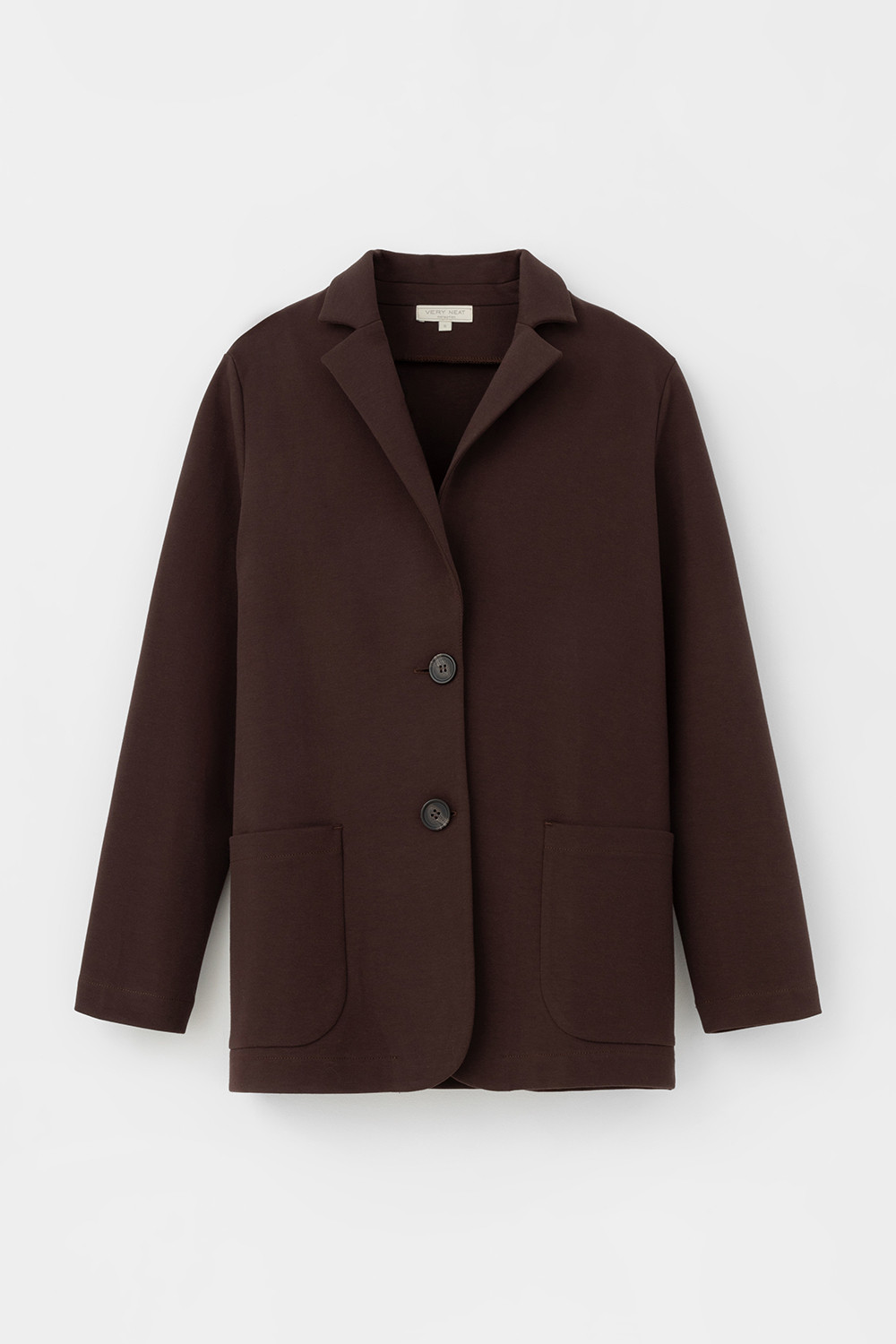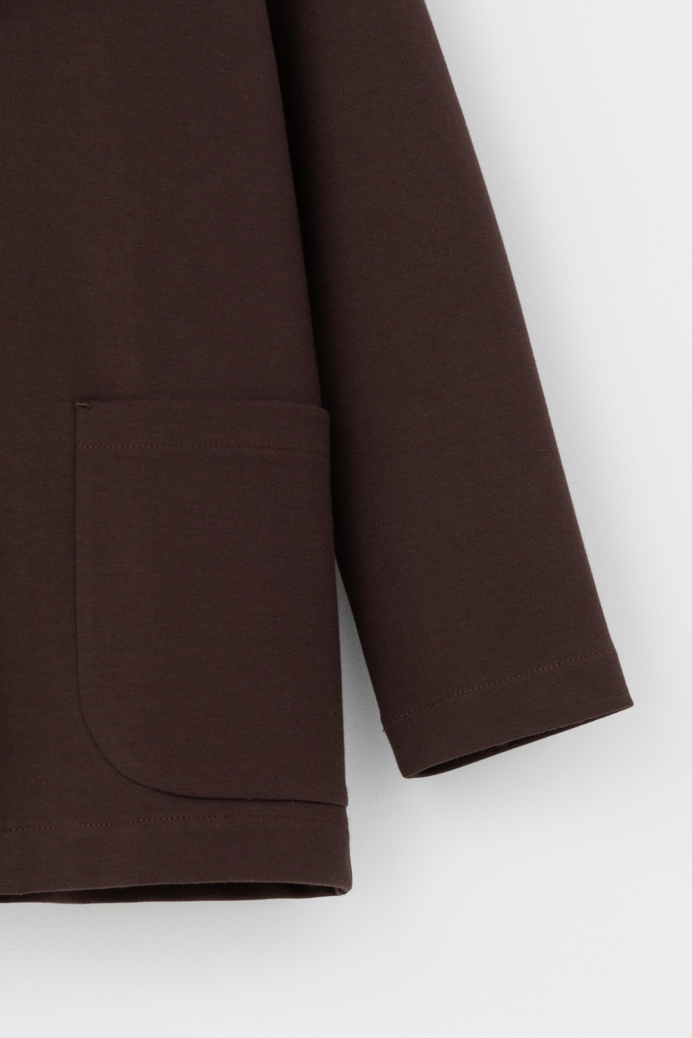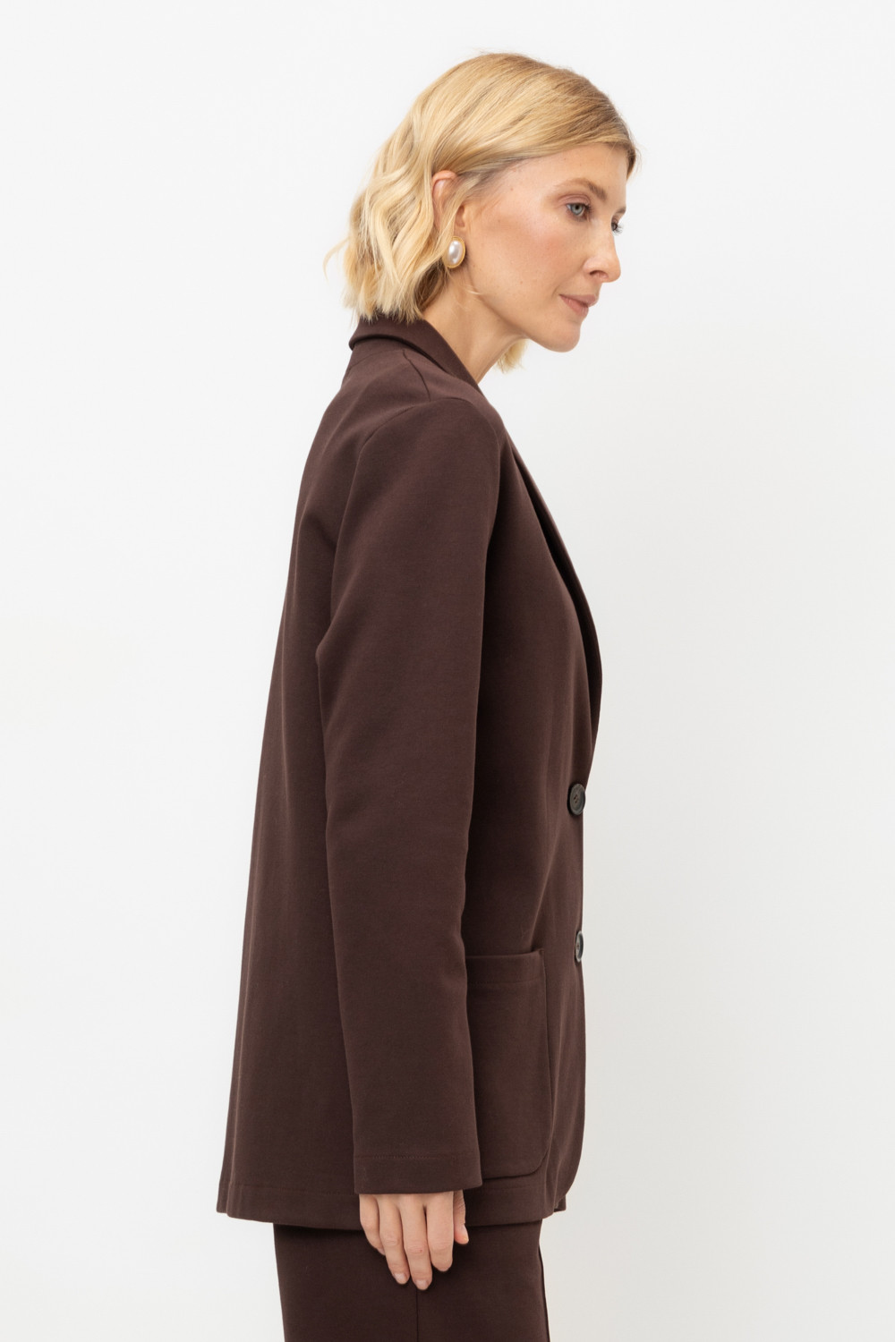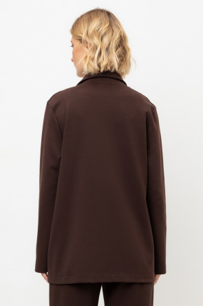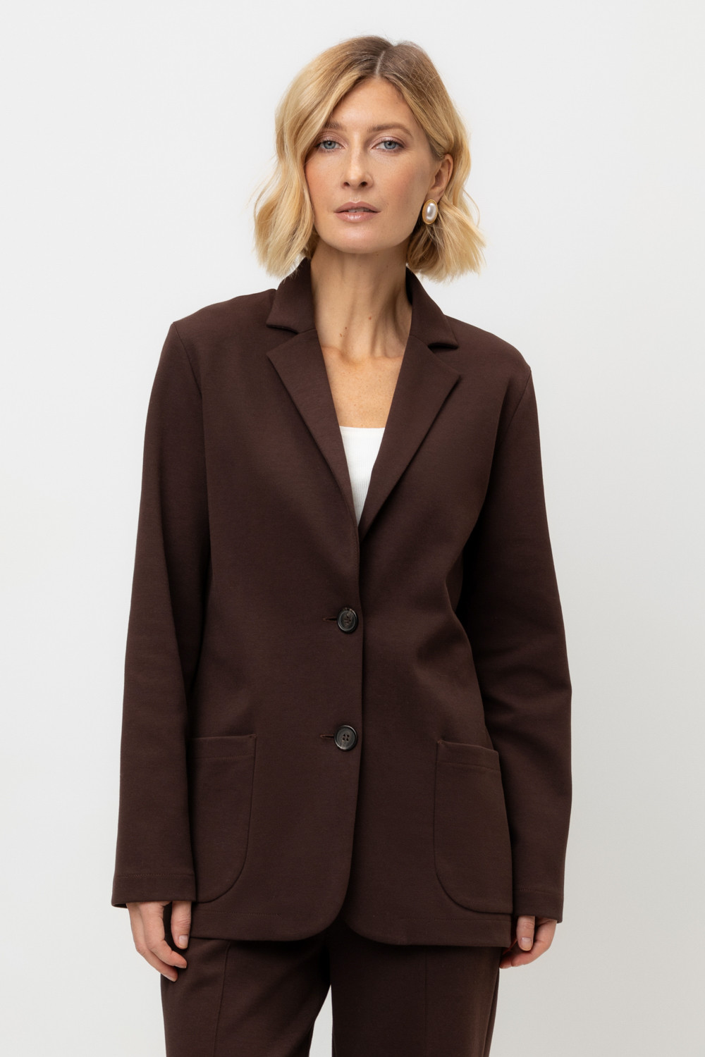 Женский жакет с карманами прямого кроя с застежкой на пуговицы и двумя накладными карманами из плотного гладкого трикотажа интерлок.