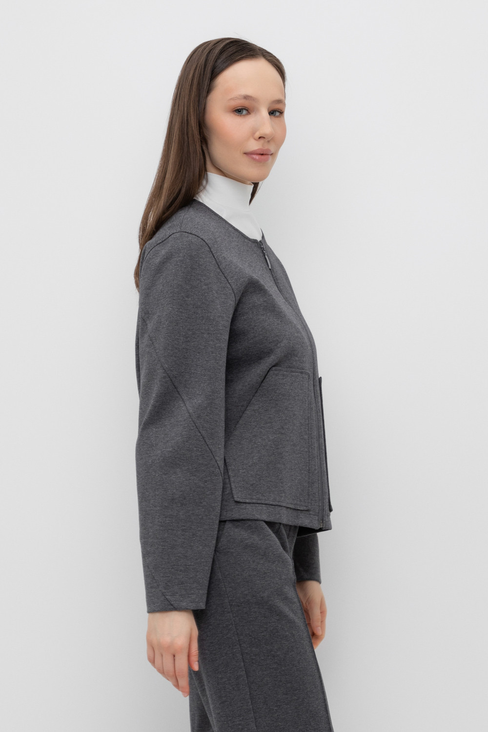Объемный жакет на молнии с накладными карманами, выполненный из плотного гладкого трикотажа интерлок. В составе 80% натурального хлопка и 20% полиэстера, при этом полиэстер ввязан внутрь по особой технологии и не соприкасается с кожей.