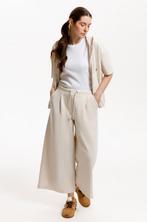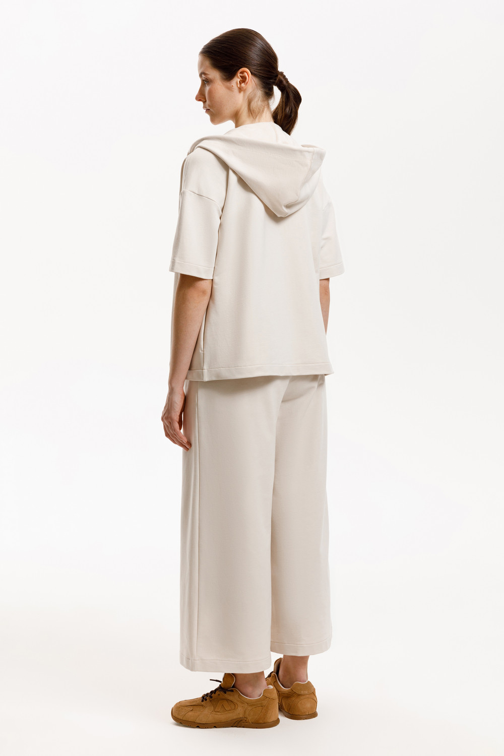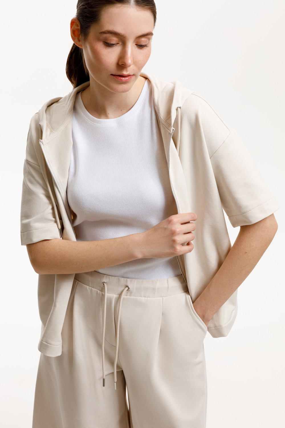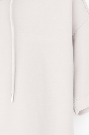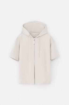 Толстовка из мягкого эластичного футера с коротким рукавом сочетает в себе спортивный и базовый стиль. Изделие дополнено капюшоном и блеском металлической фурнитуры. В сочетании с брюками из этой коллекции вы создадите образ для приятных летних прогулок.