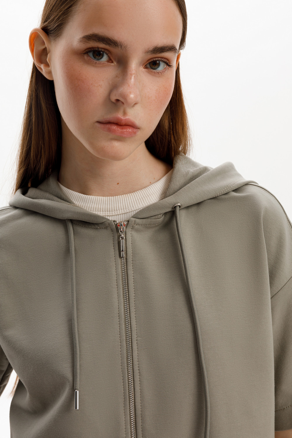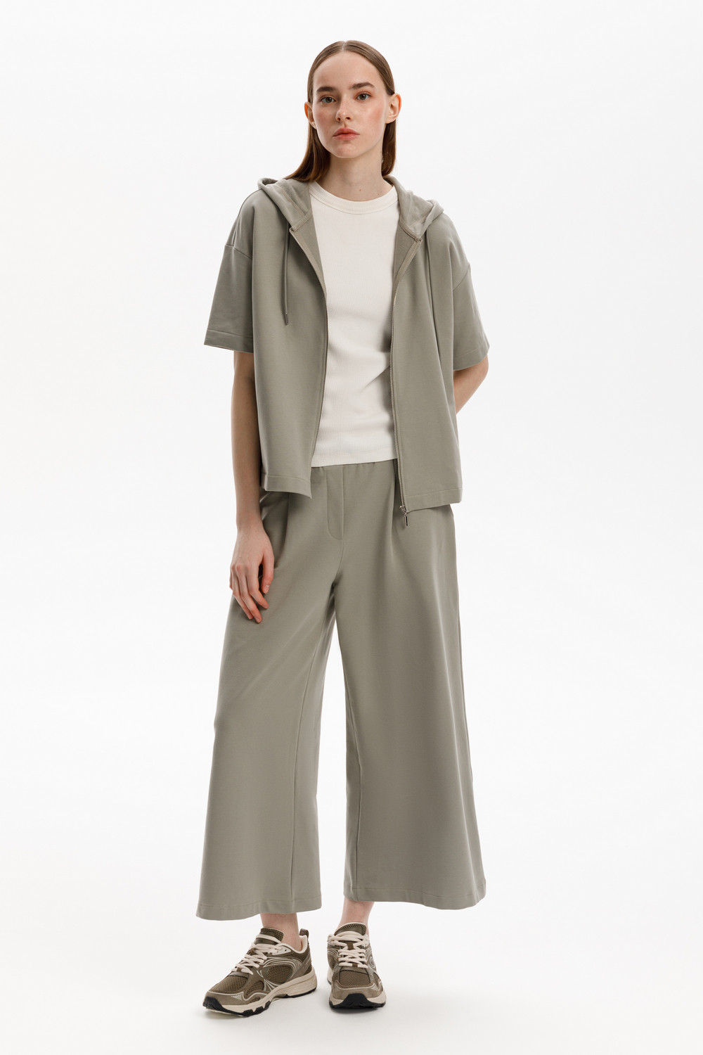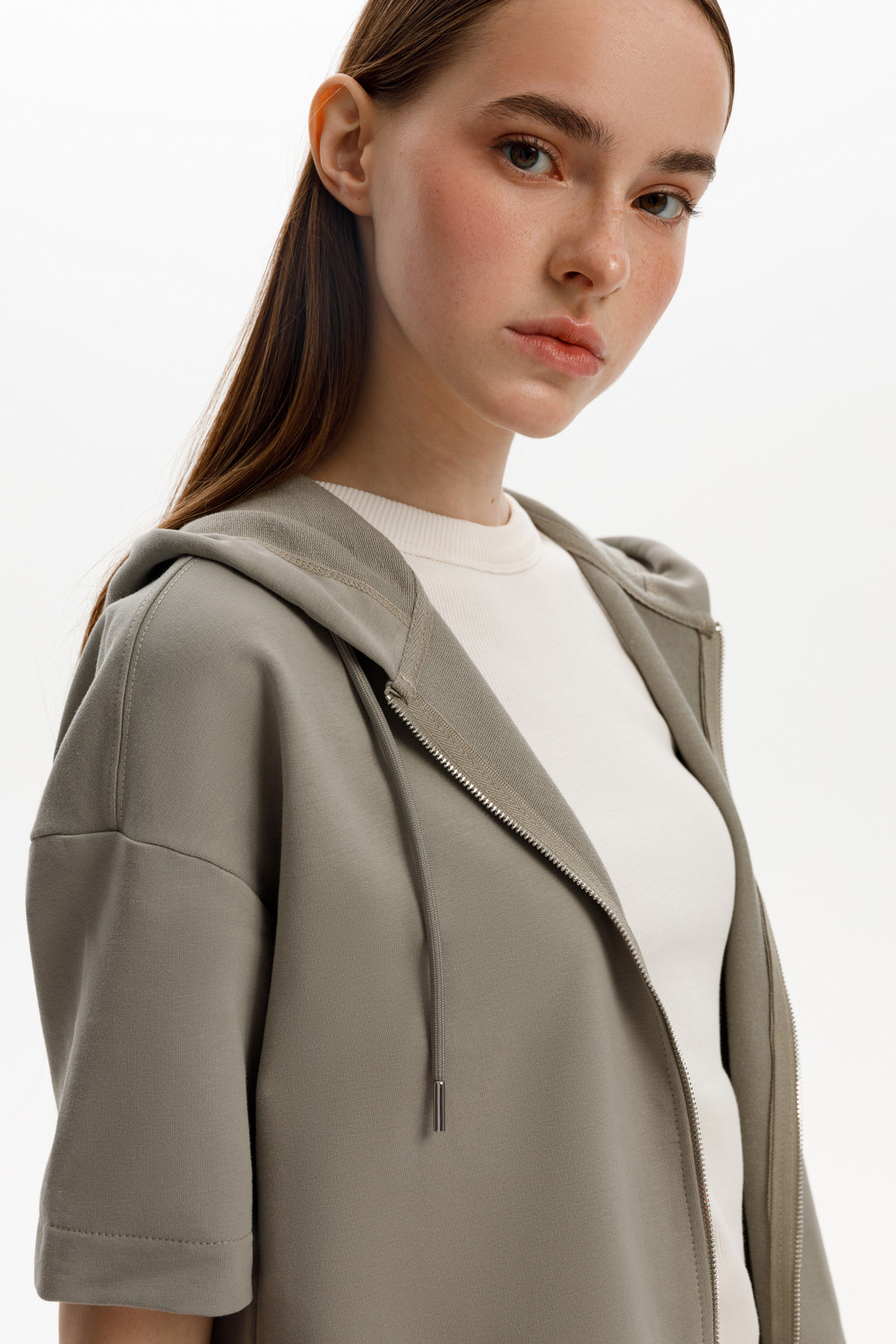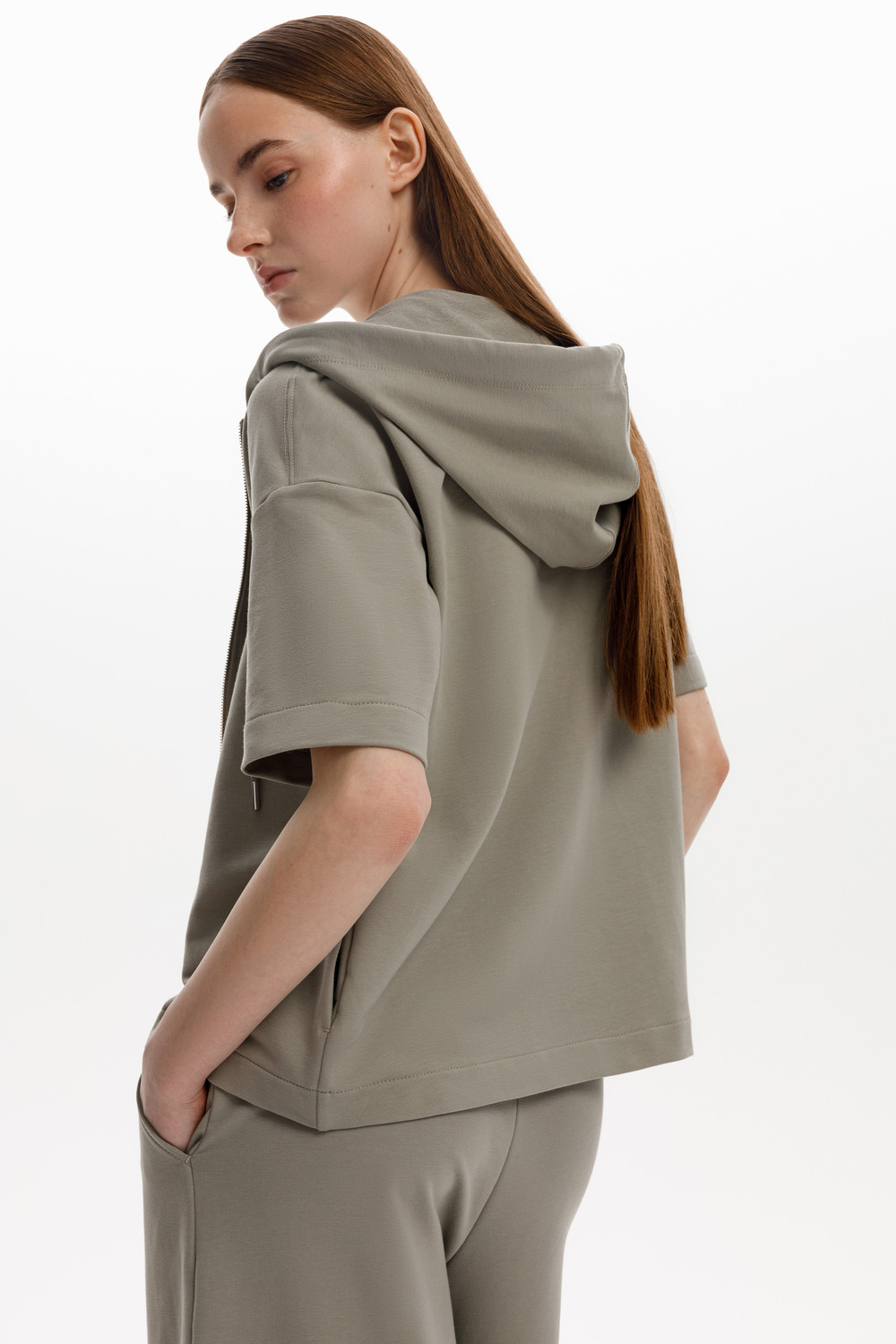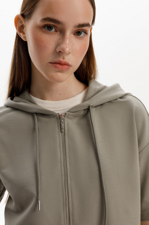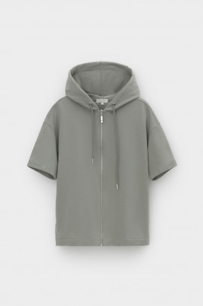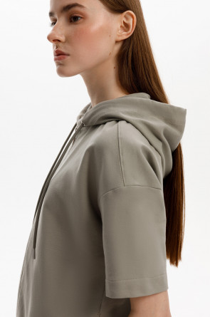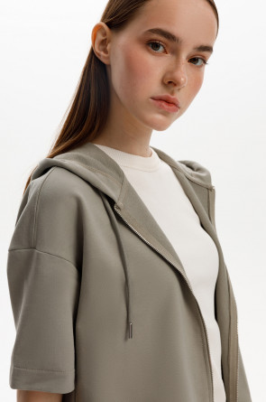 Толстовка из мягкого эластичного футера с коротким рукавом сочетает в себе спортивный и базовый стиль. Изделие дополнено капюшоном и блеском металлической фурнитуры. В сочетании с брюками из этой коллекции вы создадите образ для приятных летних прогулок.