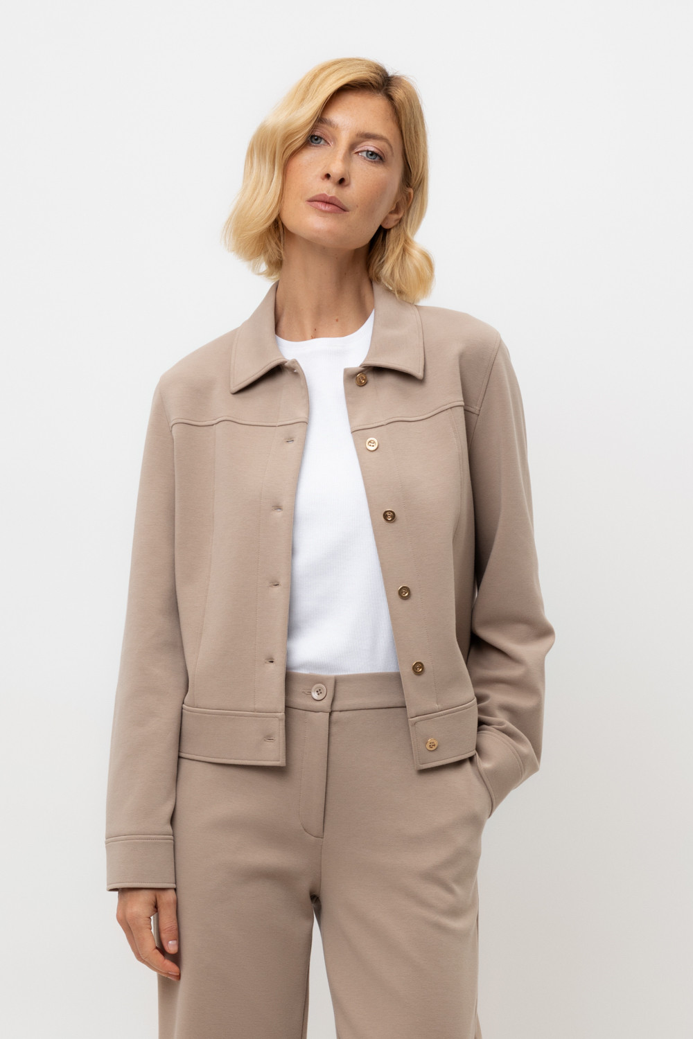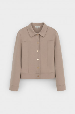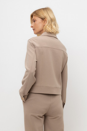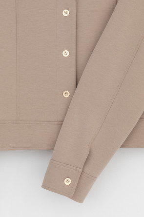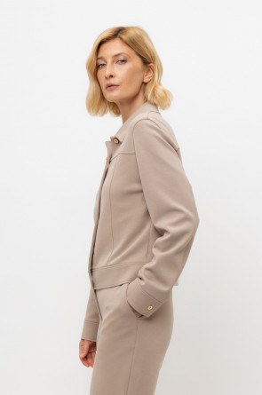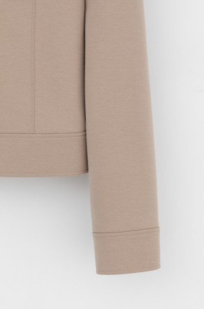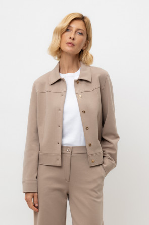 Укорочённый жакет, изготовленный из премиального трикотажного полотна DOUBLE FACE с добавлением спандекса. За счет фактуры переплетения и специальных обработок сохраняет силуэт и форму, что позволяет сочетать его как с юбкой, так и с брюками. Хлопок в составе добавит комфорта при носке.