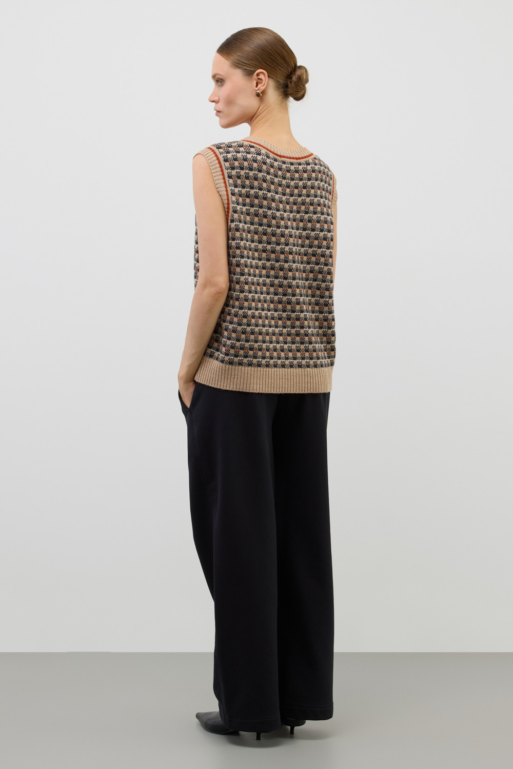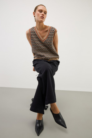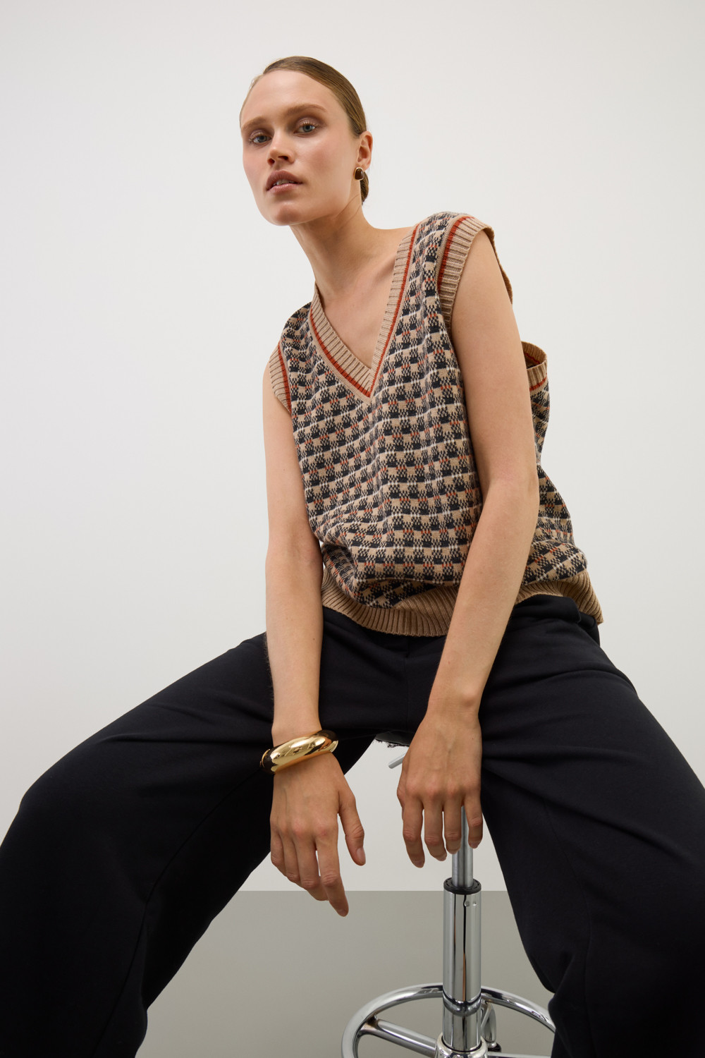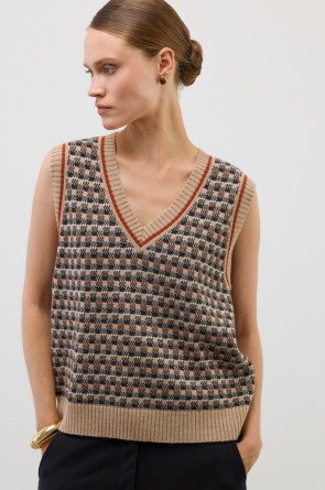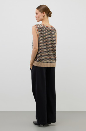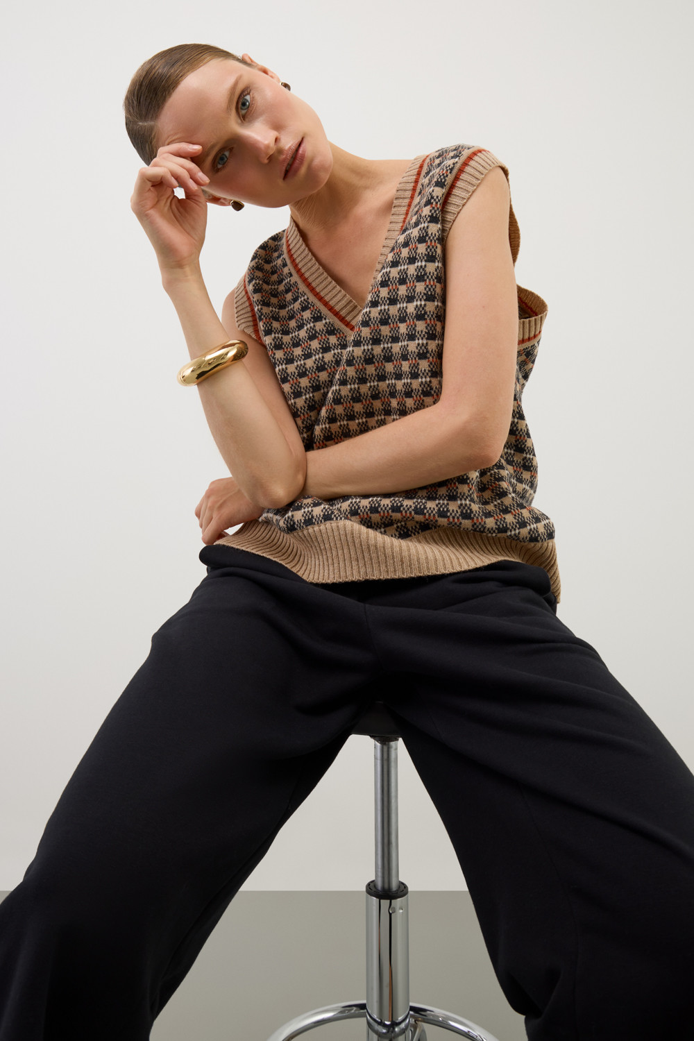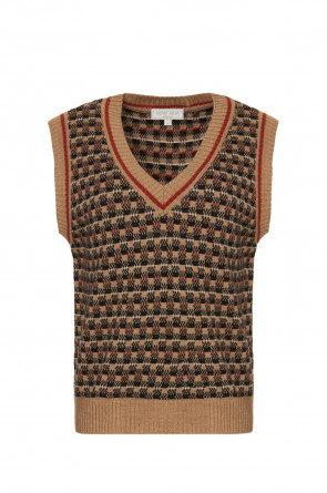 Жилет в кантри-стиле, изготовленный из высококачественной пряжи с применением передовой технологии смешанных волокон. Изысканное сочетание шерсти и акрила создает непревзойденный комфорт: модель деликатно подчеркивает силуэт, обеспечивает нежное прикосновение к коже и сохраняет безупречный внешний вид.