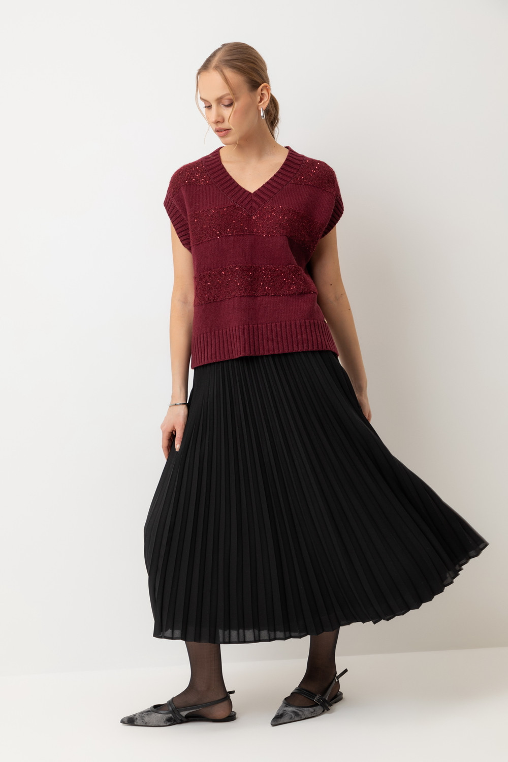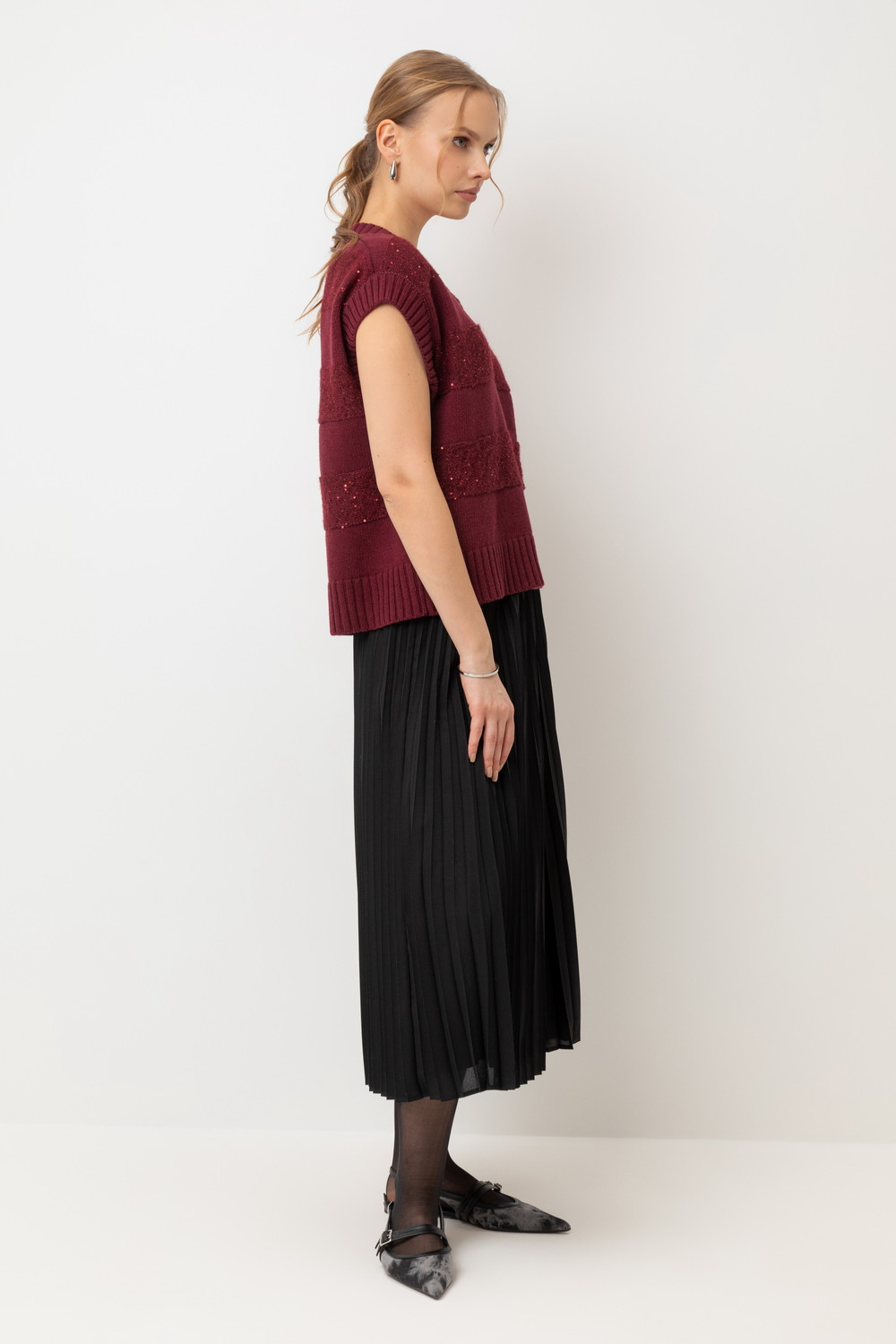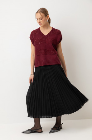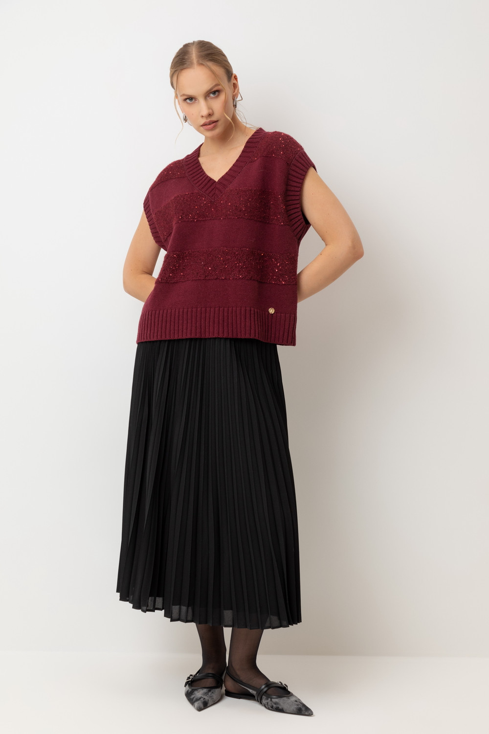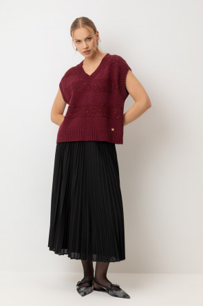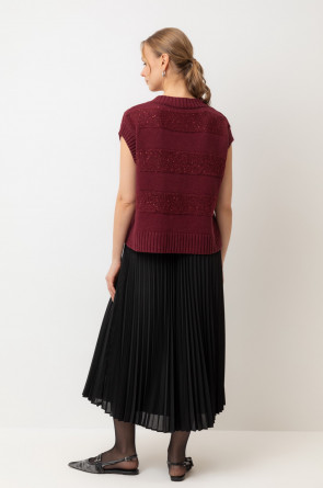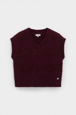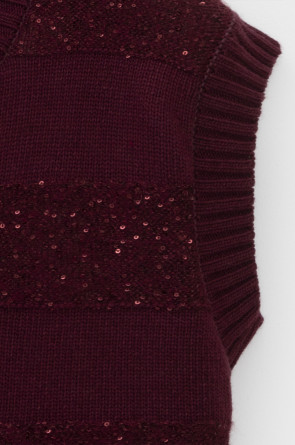 Жилет из изысканной пряжи с пайетками. Уникальное сочетание натуральных волокон обеспечивает непревзойденную мягкость. Меринос отлично удерживает тепло, альпака дарит легкость и воздушность, кашемир придает шелковистость, а вискоза приятный блеск. Нежные пайетки ненавязчиво мерцают при каждом движении, добавляя Вашему образу утонченную элегантность.